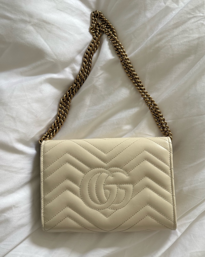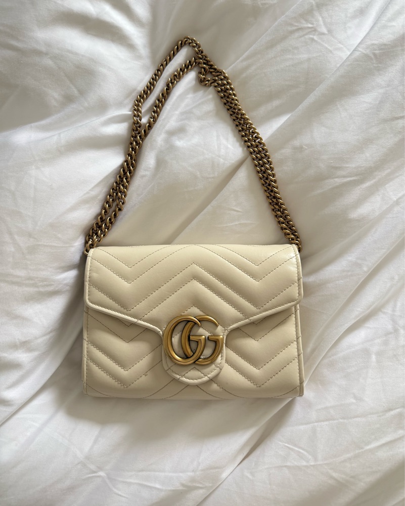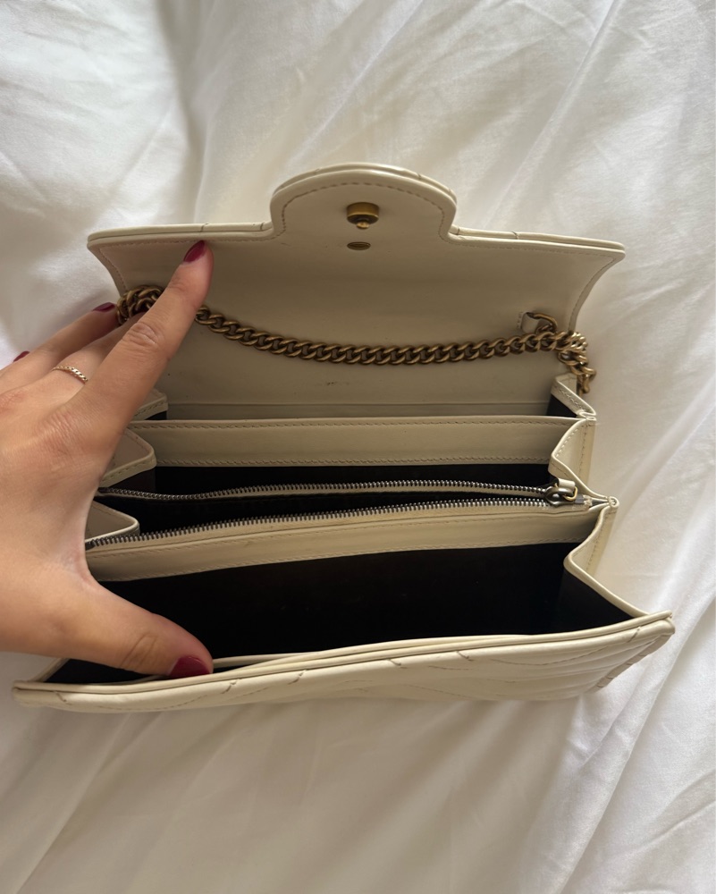 This chic Gucci bag is perfect for effortlessly elevating any outfit. The elegant quilted design and golden hardware add a touch of luxury. Please be careful bc it is white