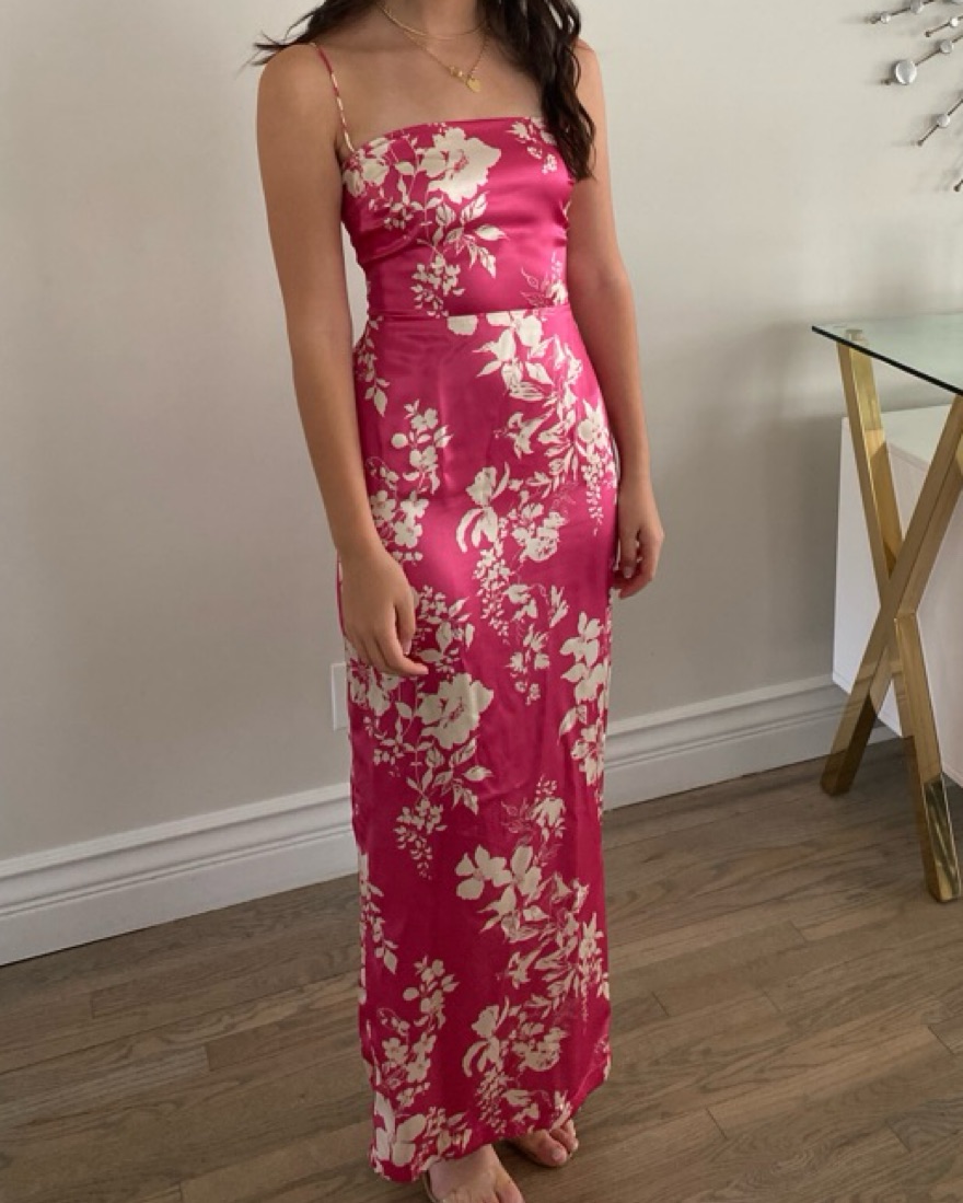 This vibrant floral maxi dress is perfect for a summer day in the city. The satin fabric and figure-flattering silhouette make it a must-have for your wardrobe.