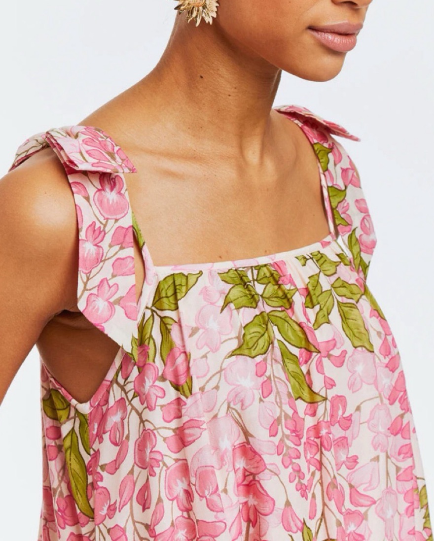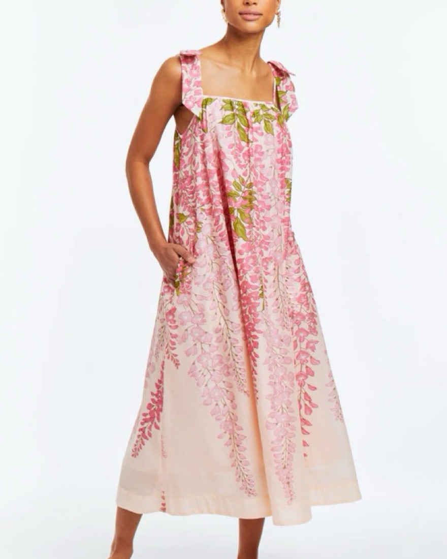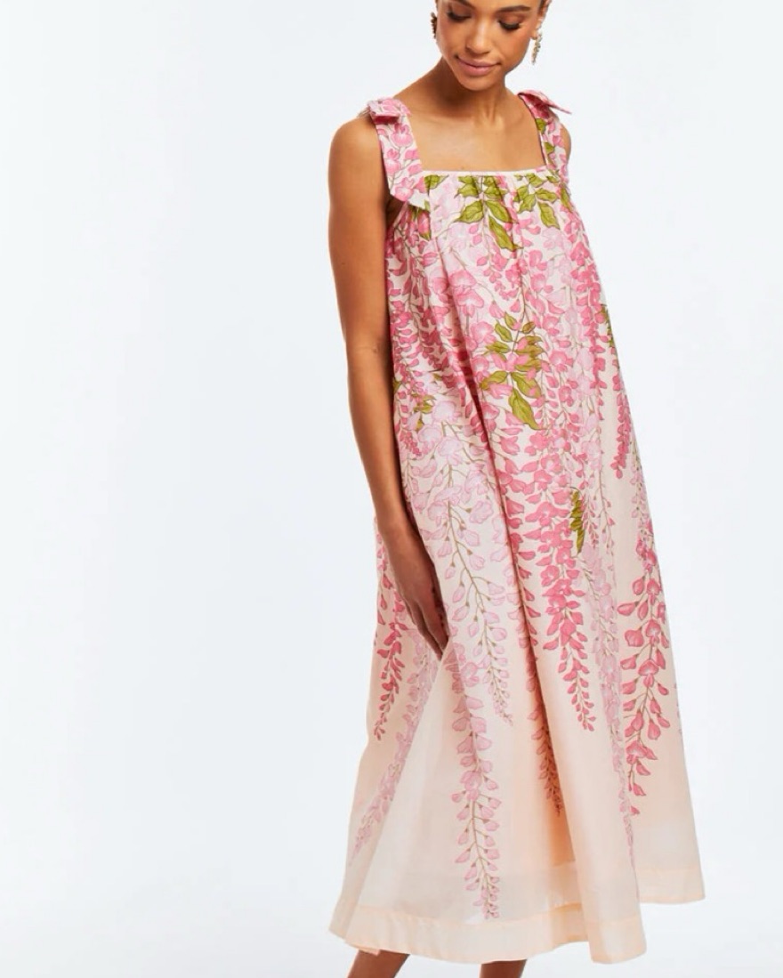 Mid-length dress with a pink whimsical wisteria print on cotton voile. So comfortable and flowy.