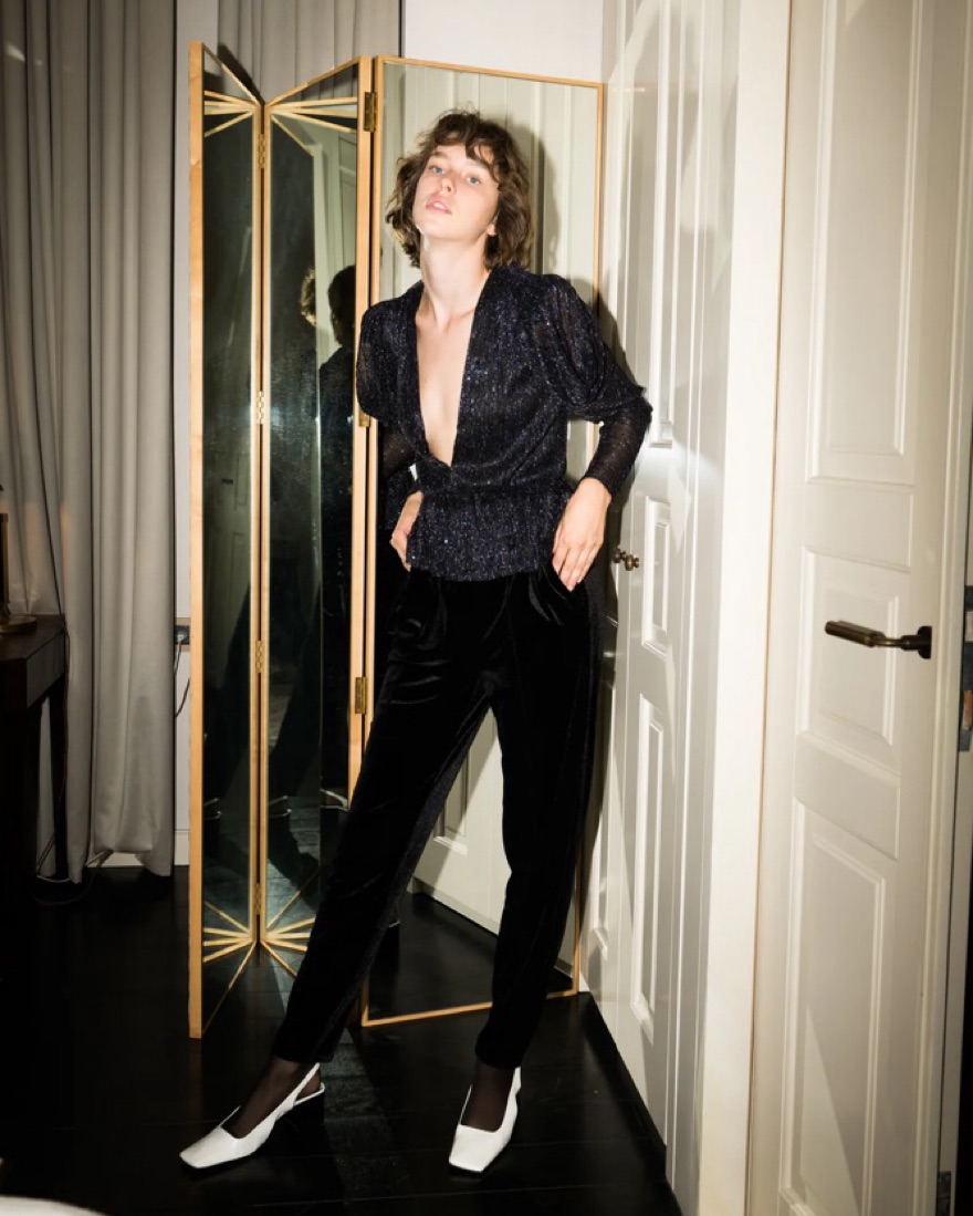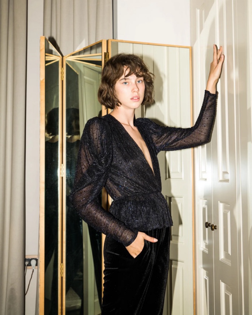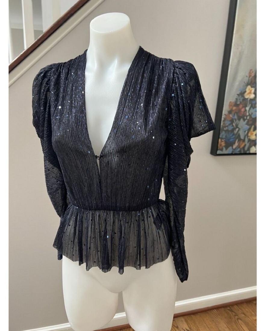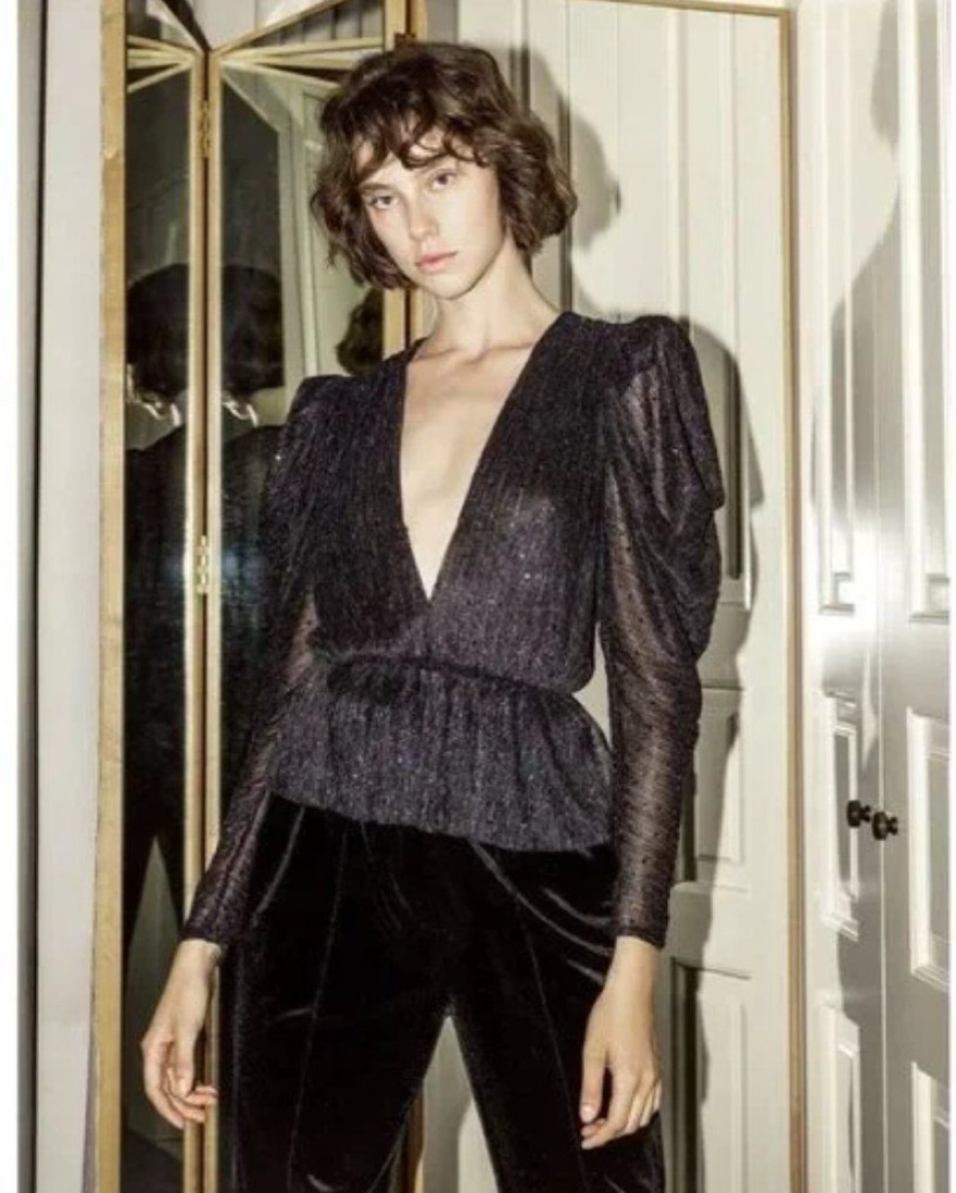 V neck top with draped sleeves and sequins, sheer material. Bruno top. Tags: Reformation, Zara, Anthropologie, Staud, Ronny Kobo, Retrofete