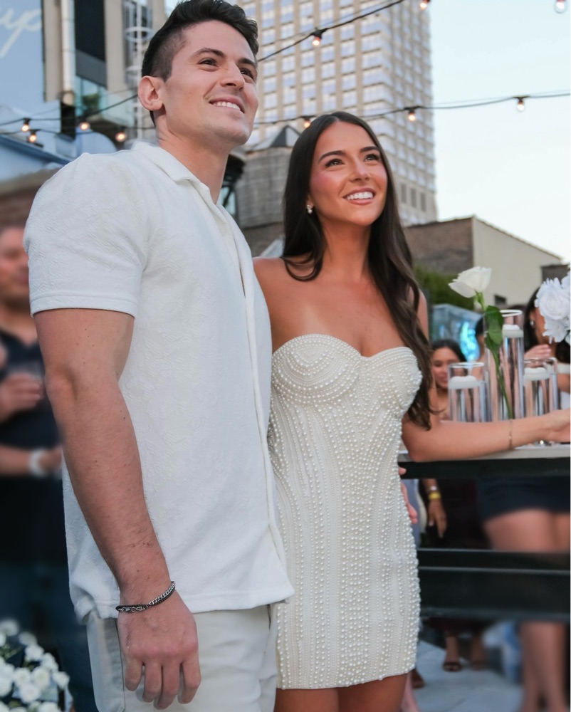 This pearl white mini dress is perfect for a glamorous night out. Was perfect for my engagement party! $1,300 + retail on Retrofete. Slight spray tan mark on inside of the dress, but has been dry cleaned and not at all noticeable when on!