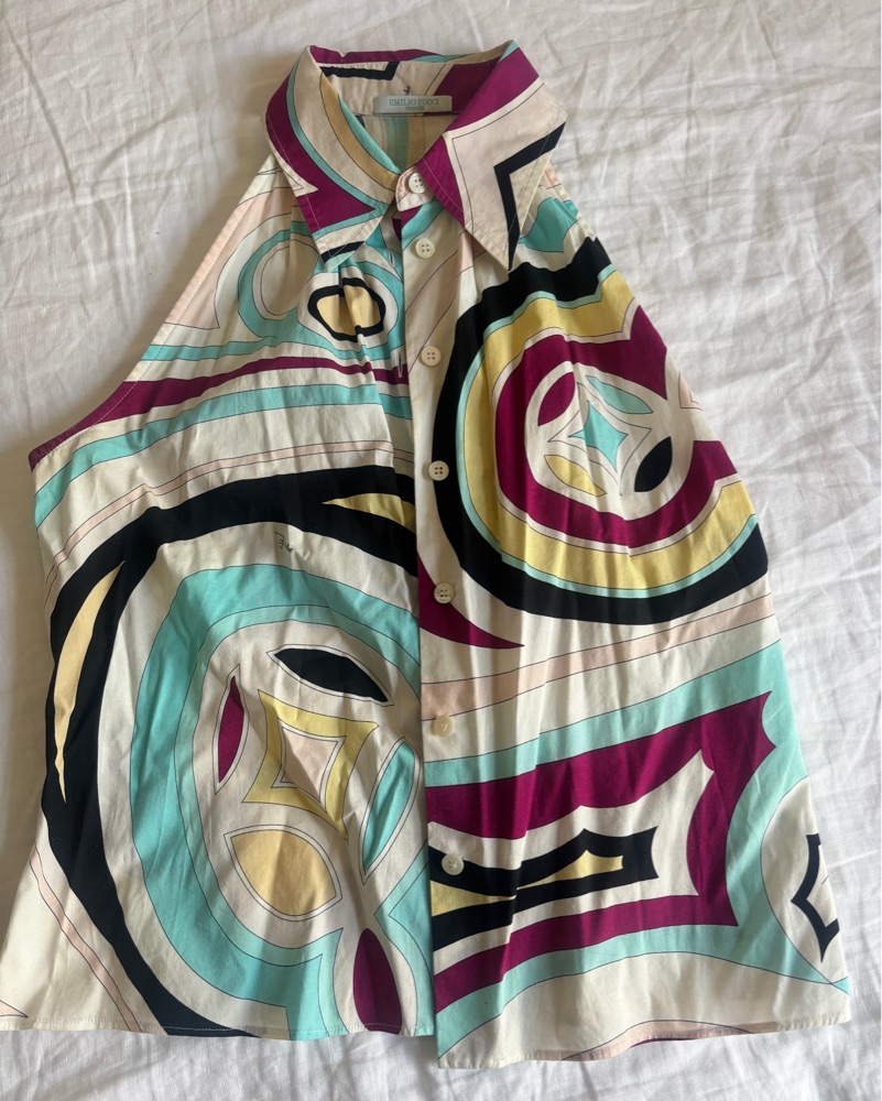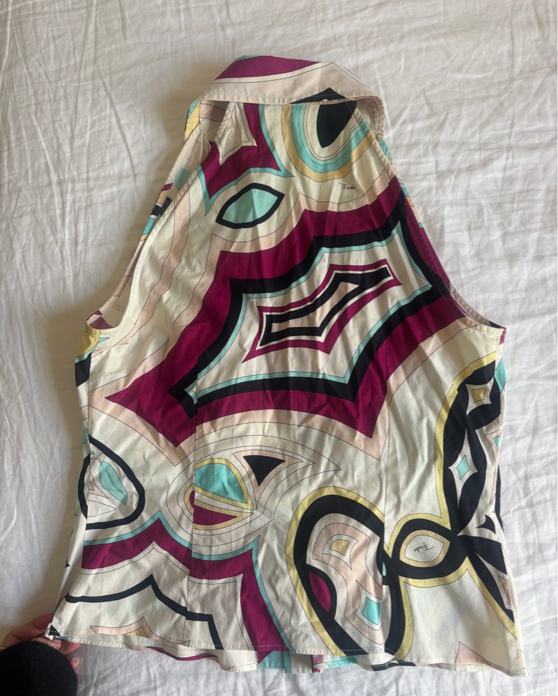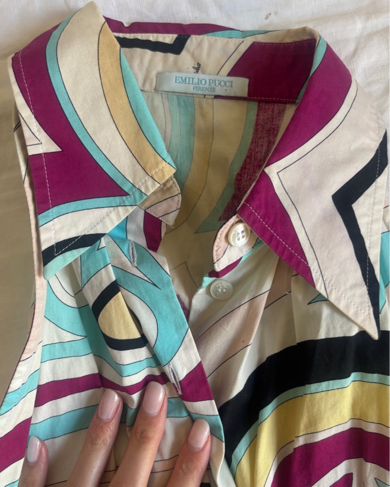 Colorful fun collared cotton Pucci top, perfect for summer or vacation!! Bought this as a size “small” would fit sizes 4/6