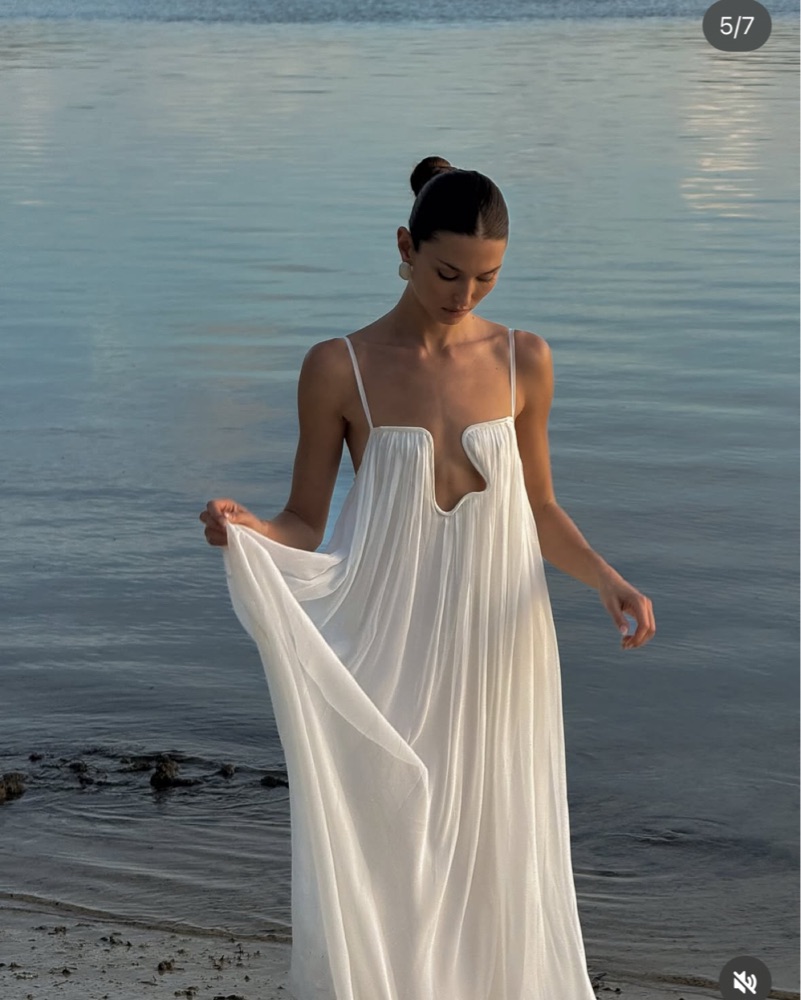 Sculptural, flowy maxi dress with a plunging chest cutout