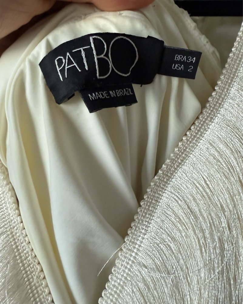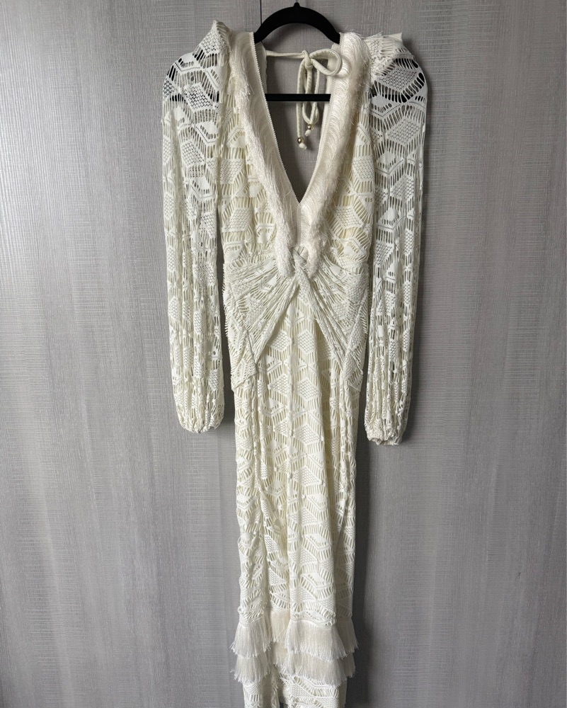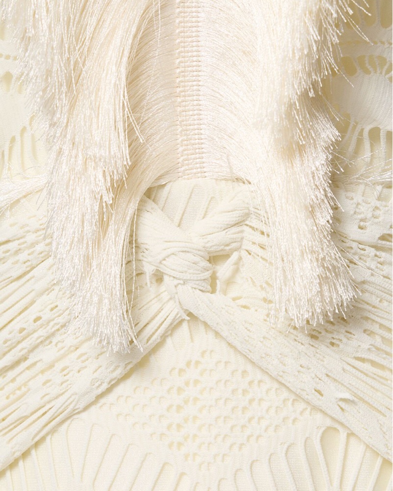 Back self-tie closure Elastic cuffs Open back Center back slit at hem Fringed trim
