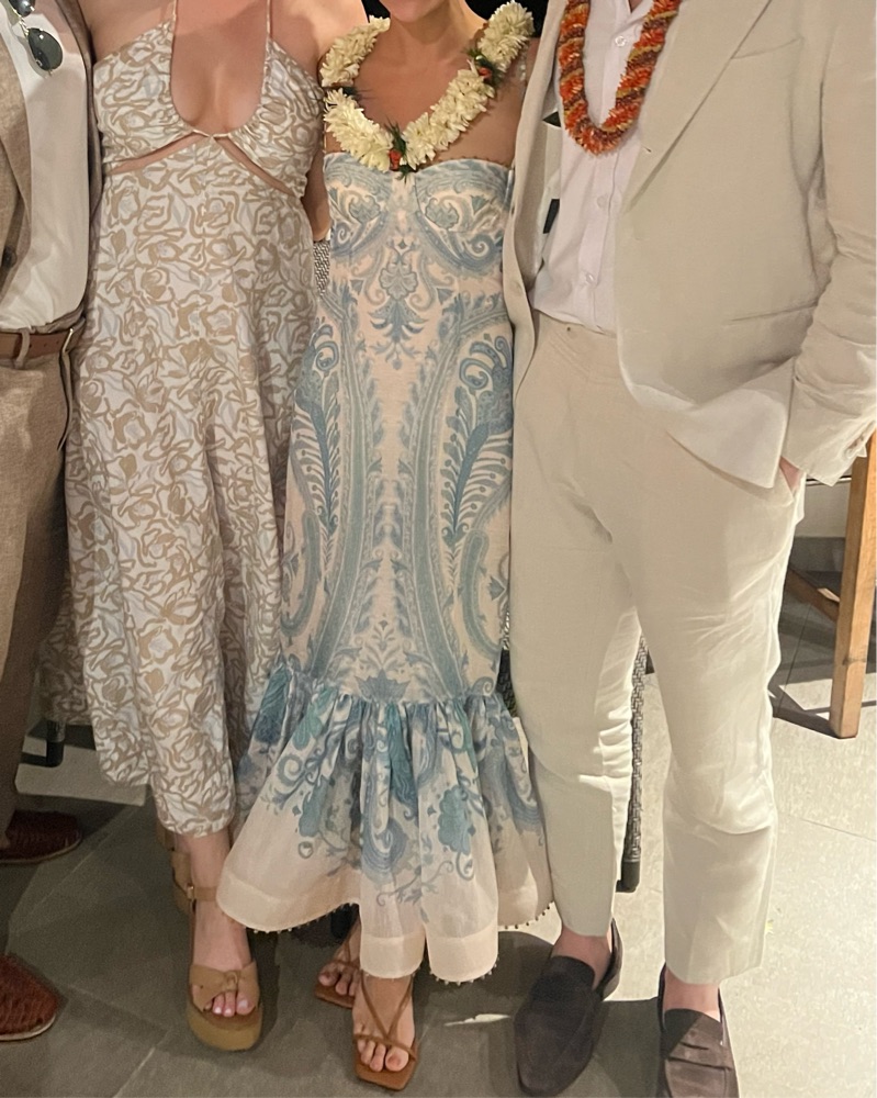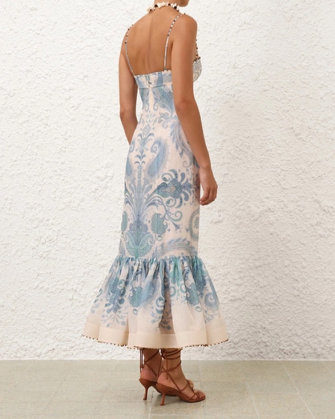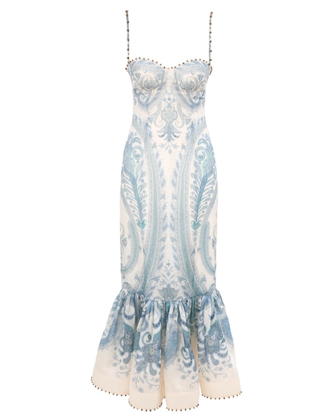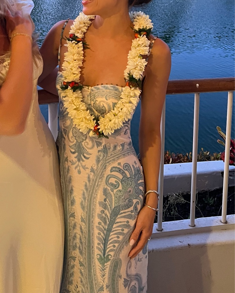 My favorite dress I’ve ever owned! So gorgeous for any summer events. The Illuminate Gown in Turquoise Paisley is a silk linen maxi dress w/ a sweetheart neckline and beaded trims on the top edge, straps, and hem.