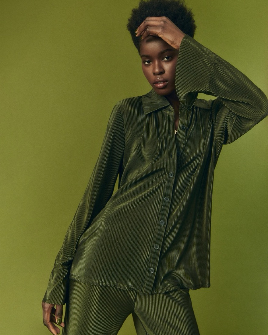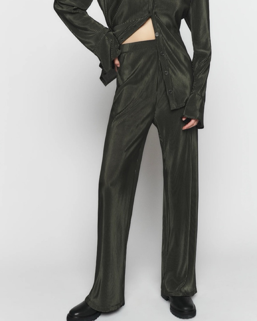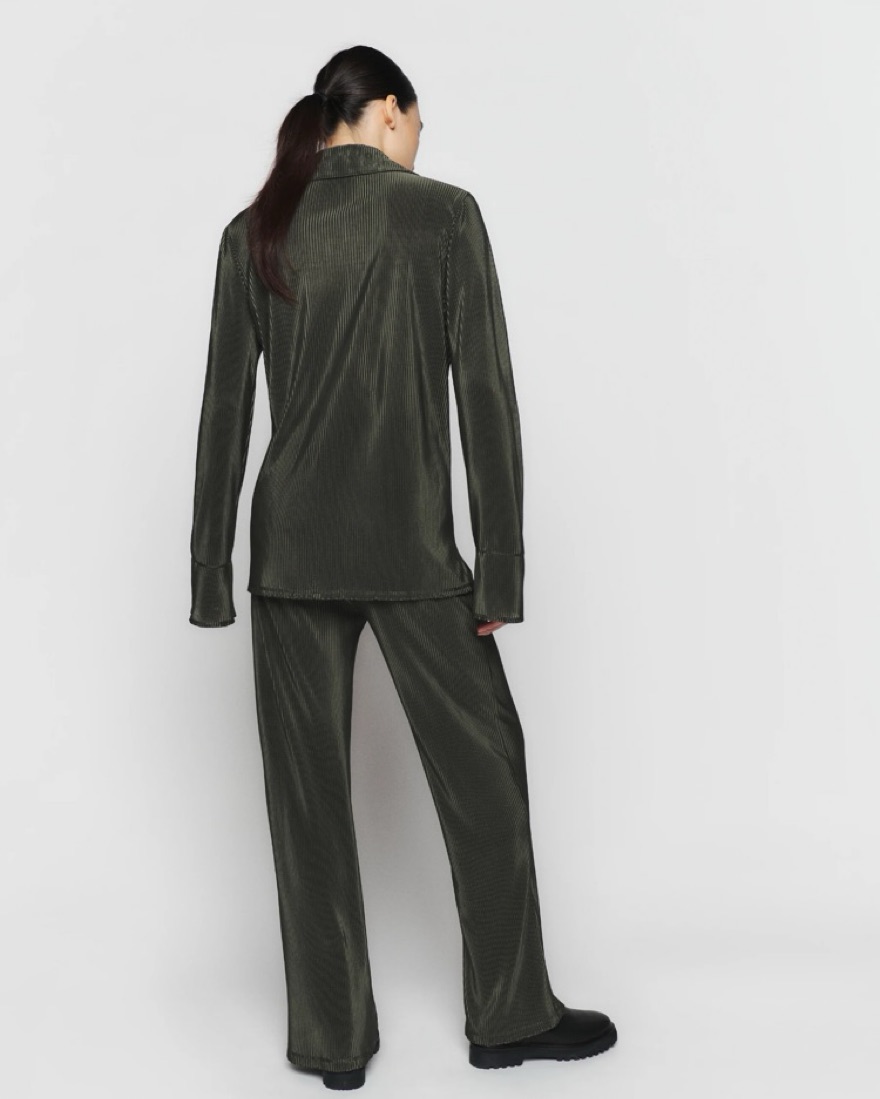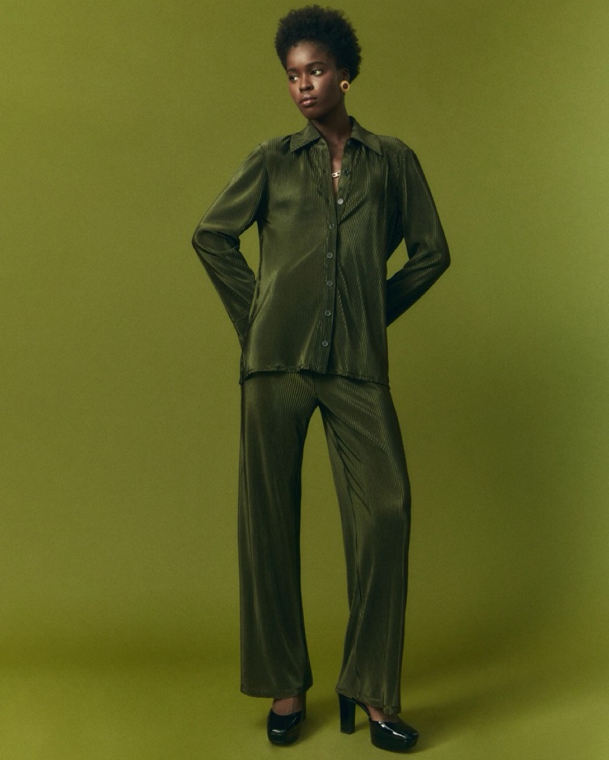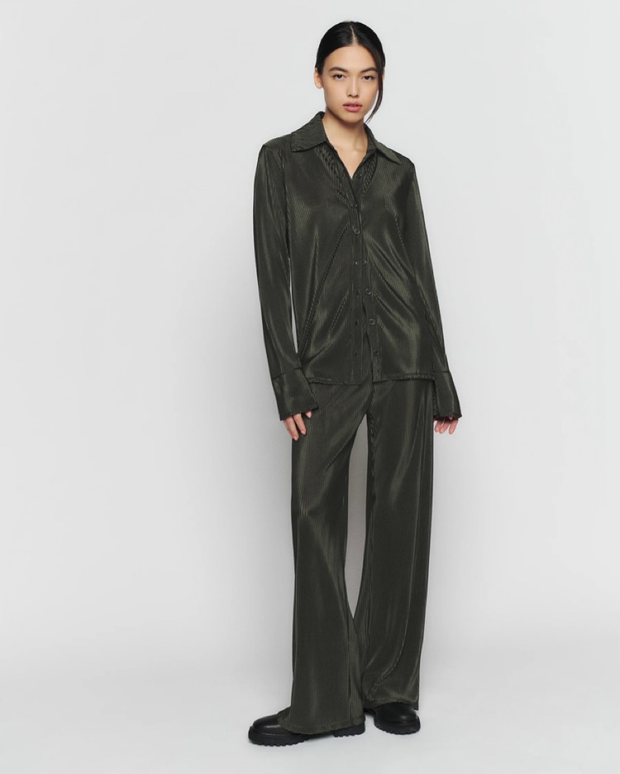 Carrington two piece shirt and pant set. Plisse satin material. Pants have elastic waistband. Size XS but runs very oversized. Could fit XXS-S. Do not wash or dry clean! Pants are just a tiny bit long. Safety pin them up or roll up the waistband.