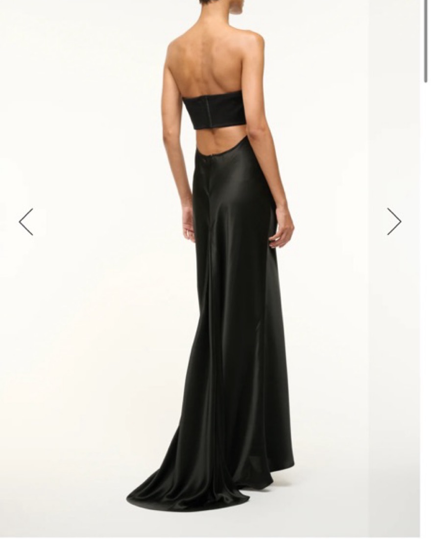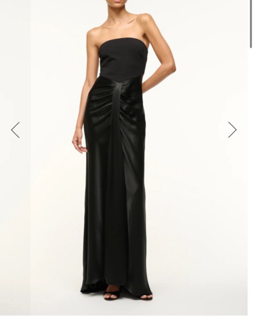 The Wayfaring Dress is a timeless evening gown with a ponte bodice and a ruched satin skirt. This strapless dress features a strapless bra-friendly bodice, with an open lower back. Neck tie in photo included.
