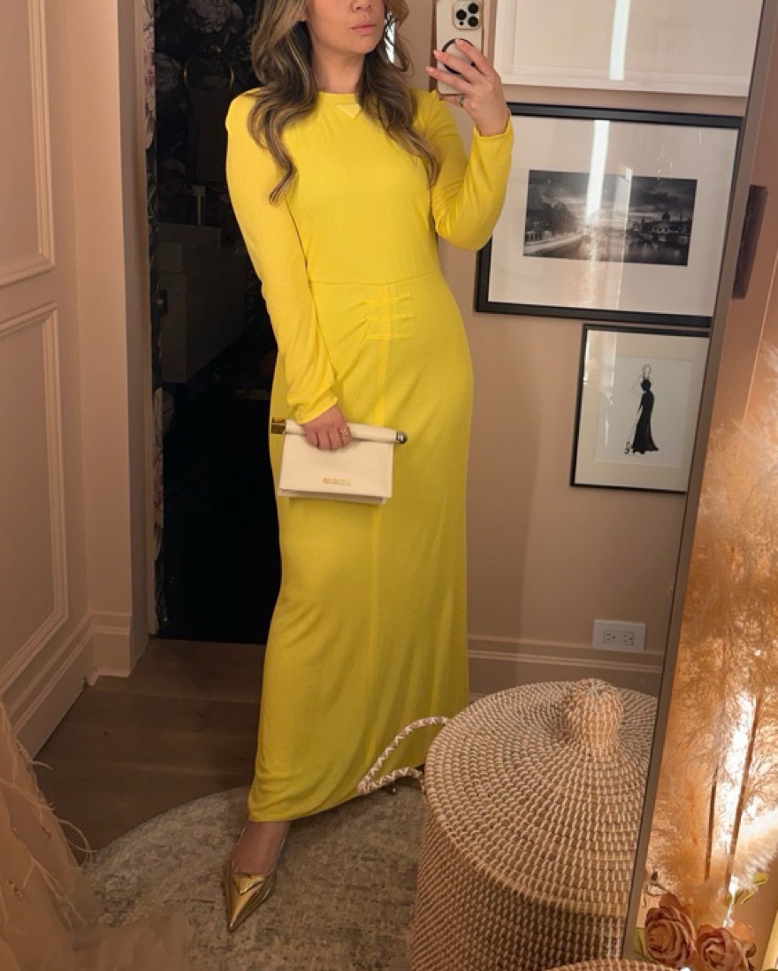 This stunning yellow maxi dress is perfect for a spring or summer event. The long sleeves and form-fitting silhouette create a sophisticated look. Has some stretch and the fabric is lightweight.