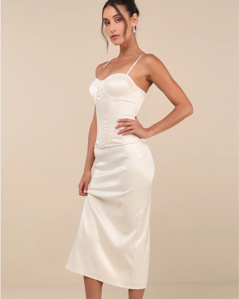 This chic and sophisticated white midi dress is perfect for a special occasion or formal event. The figure-flattering silhouette and delicate details make it a timeless and versatile choice.