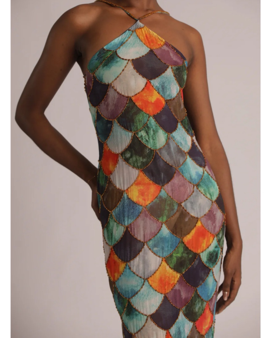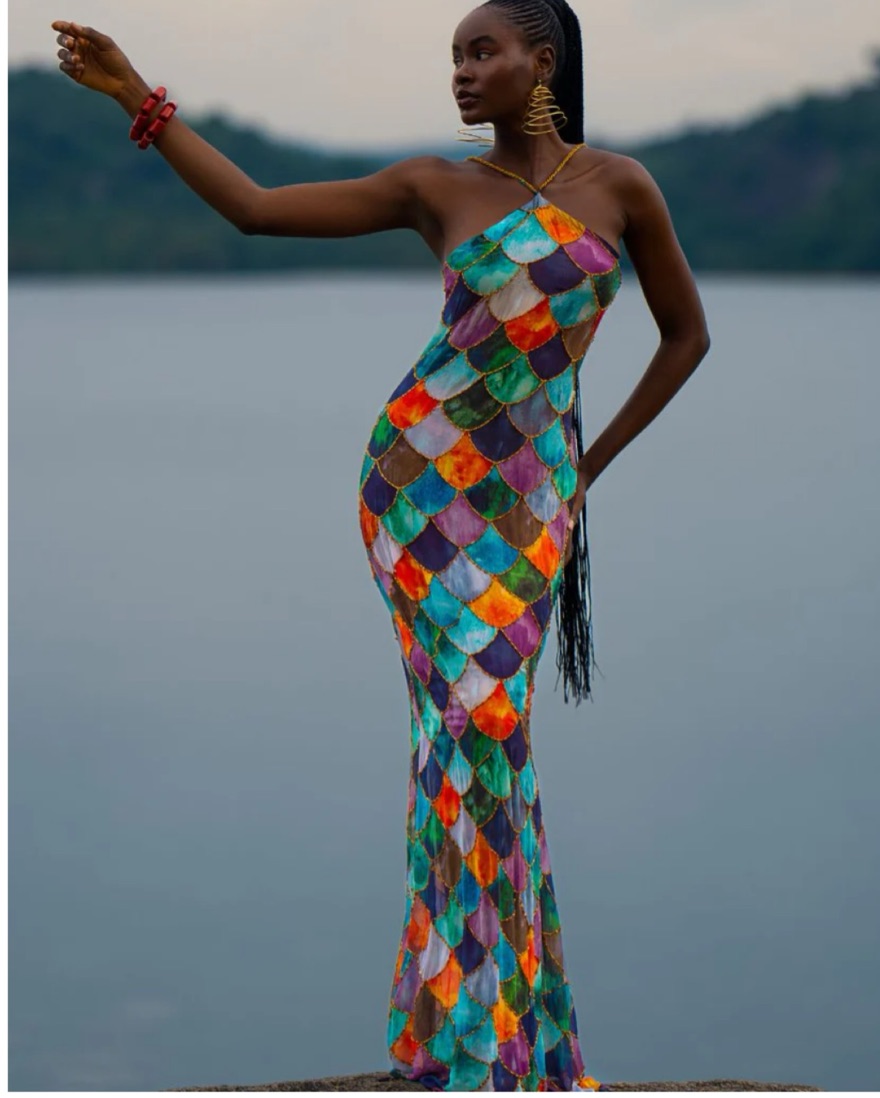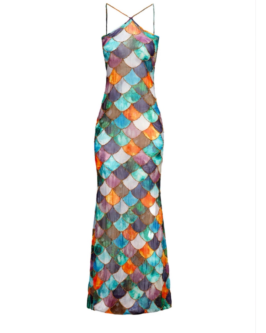 **Any damage to the dress beading will require replacement due to the nature of the beading** Hand-painted chiffon with gold beading details. Stunning floor length gown for events such as weddings. You will receive so many compliments.