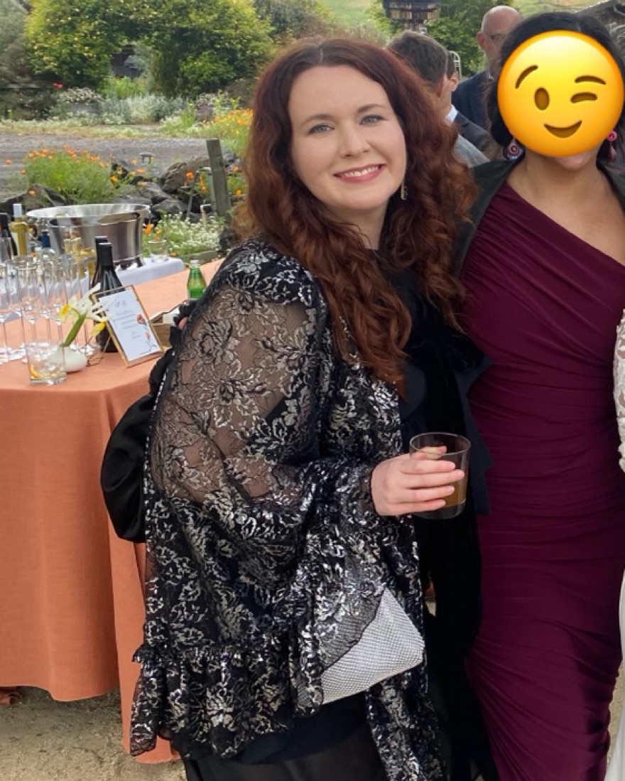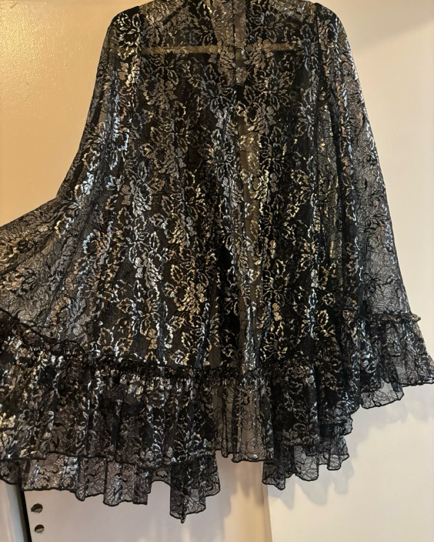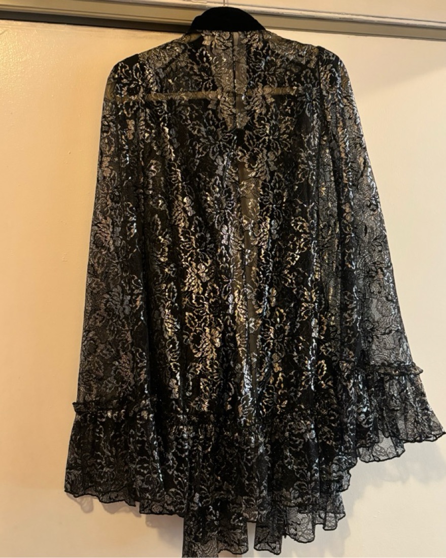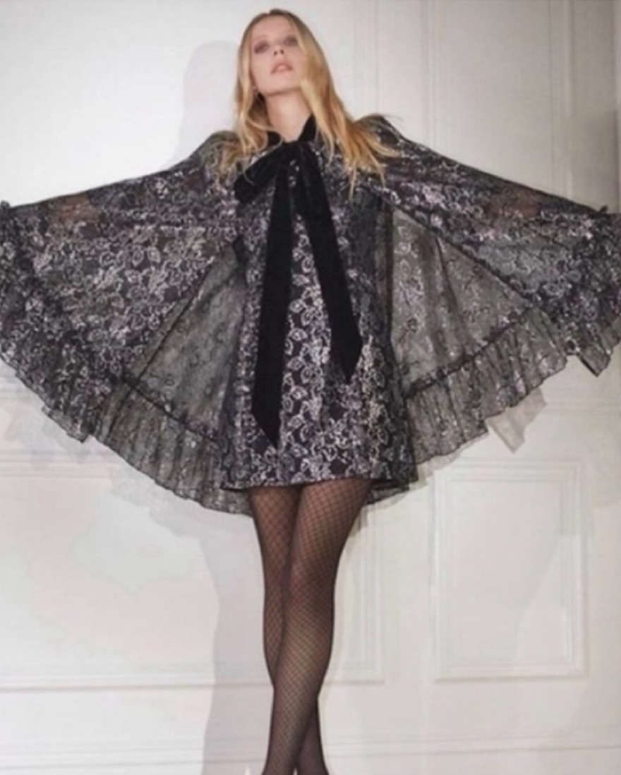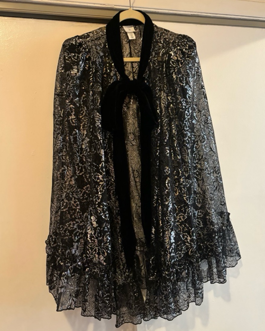Sold out everywhere, even hard to snag on shopping resale sites. Only worn a few times for special occasions like weddings and holiday parties. Dramatic shoulders and a velvet tie at the neck. It’s XL but given it’s a cape, it also works very well for my frame that L normally works for.