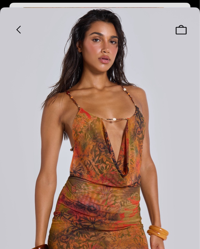 Printed Plunge mesh mini dress with beaded straps , backless style, super plunge neckline, fully mesh lined, wearing a size US 2 ( UK 6)