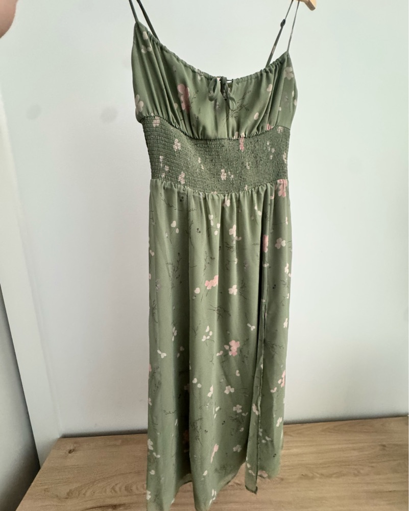 Light sage Green midi dress with slit and floral pattern