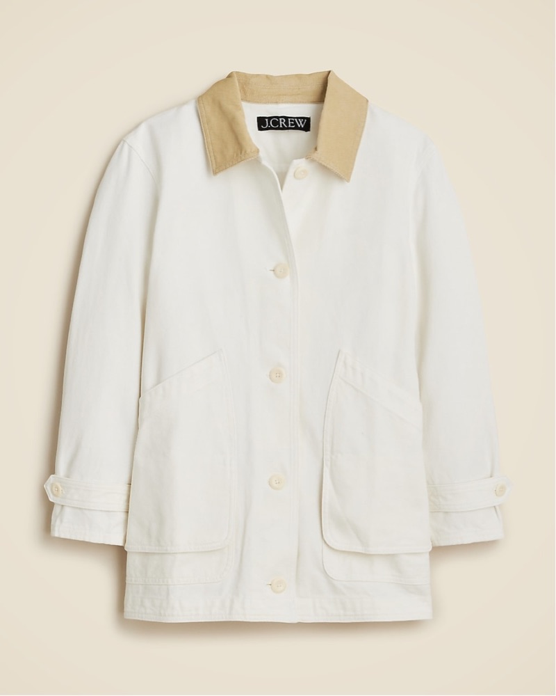 J. Crew barn jacket in white canvas. Sleek and polished no matter what you're wearing underneath, thanks to a couple of can't-miss details: the contrasting corduroy collar, flap pockets and a durable 100 percent cotton canvas finish.