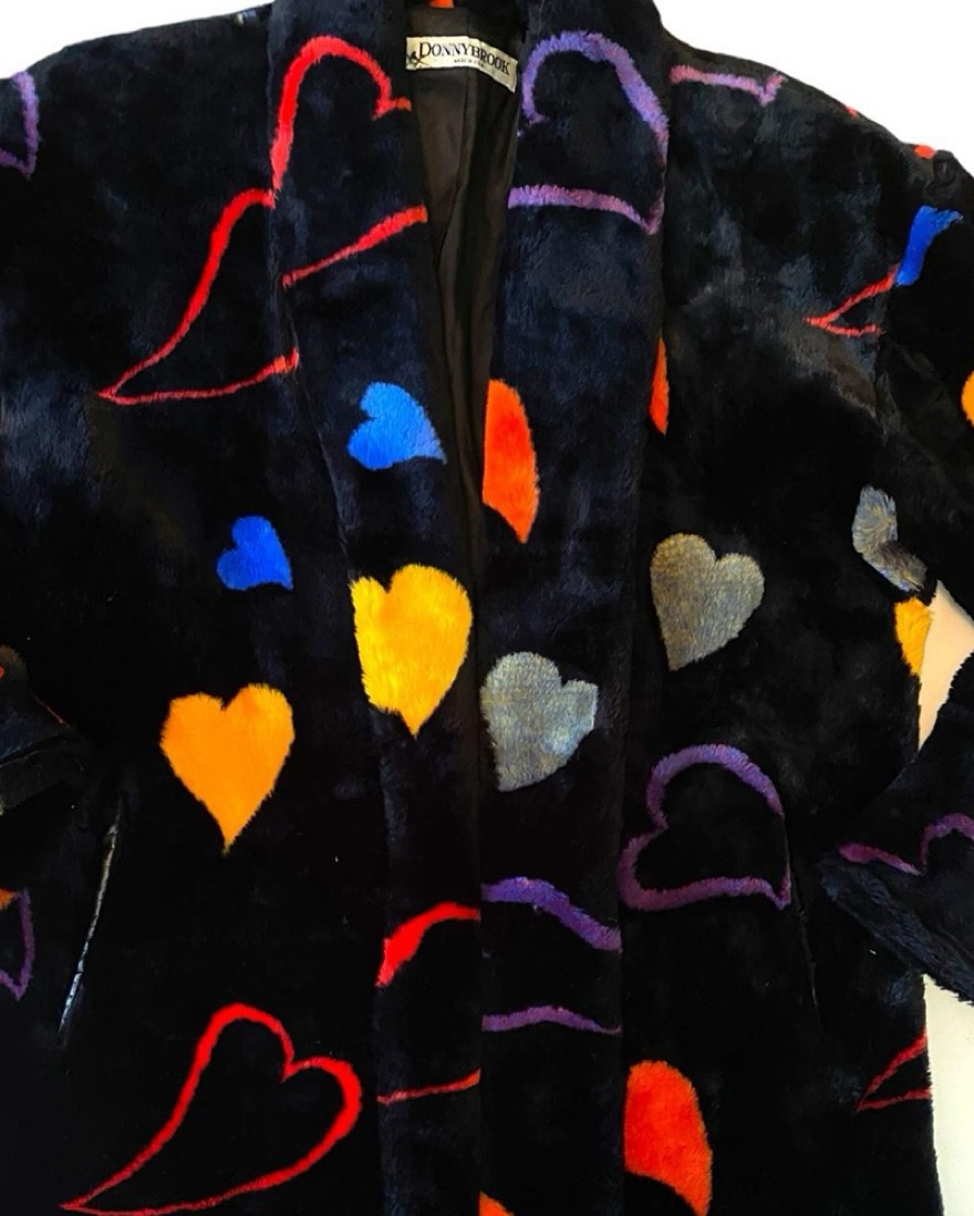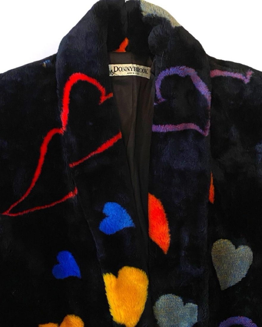 Insane vintage 70s/80s fur coat by Donnybrook. All over colorful heart design on black plush faux fur. Very sought after and rare! Size marked one size. Oversized fit