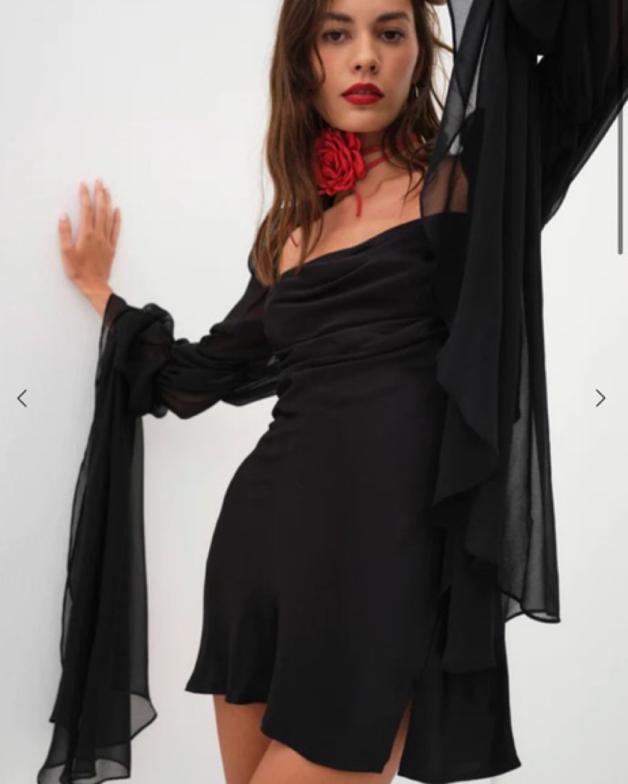 This vintage-inspired mini dress features a delicately draped cowl at front and back bodice with cascading chiffon poet sleeves and tulle shoulder pads. Button and zipper closures at back.