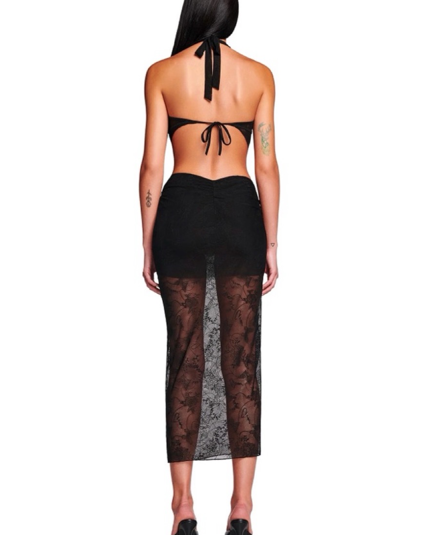 Black lace halter neck top featuring a beautiful custom 'GIA' Monogram butterfly print - All over, repeat print