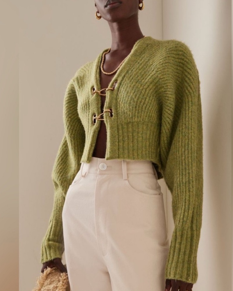 Designed in a lush melange wool, this cropped and open cardigan is as comfortable as it is cool. Two signature brushed brass hardware chains at the bust allow for a relaxed fit and alluring openness. The slightly puffed sleeves that slim at the wrist give a striking silhouette.