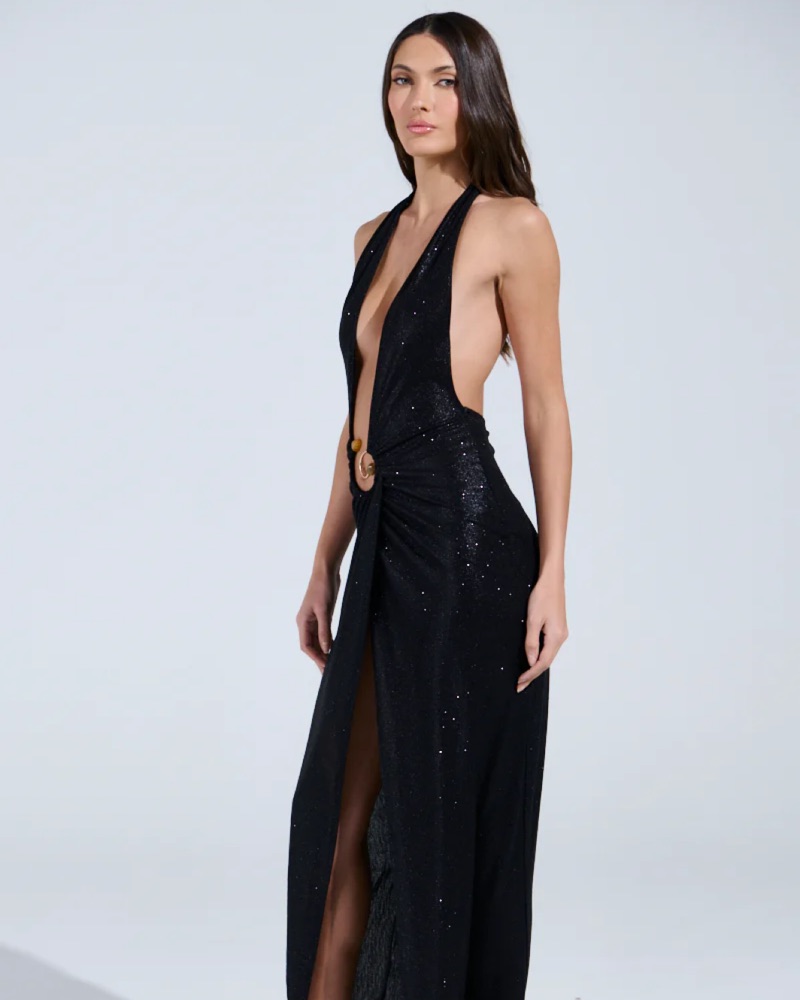 This glamorous sequin halter dress is perfect for a night out on the town. The open back design and thigh-high slit create a show-stopping look.