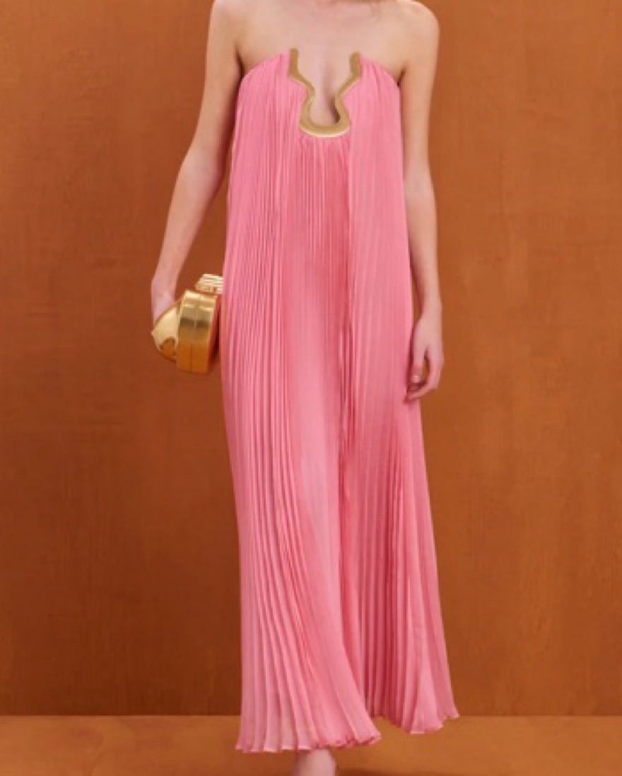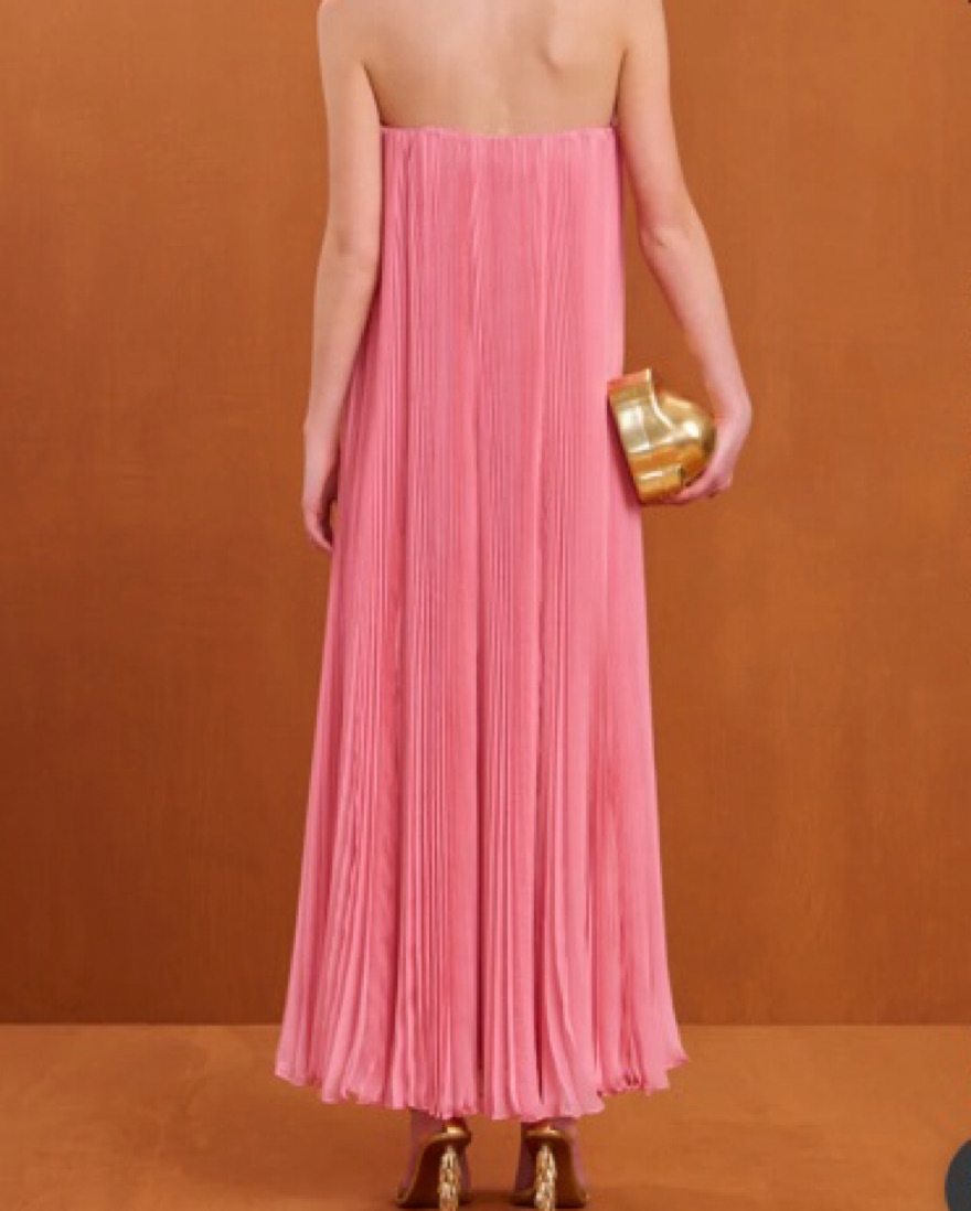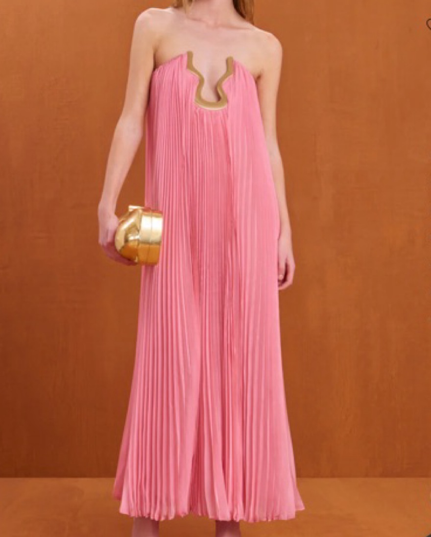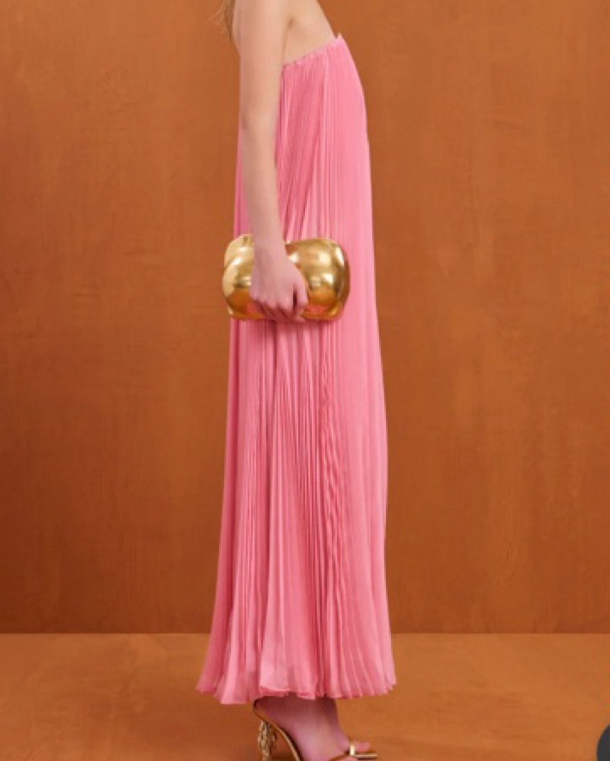 NEVER WORN. Size 00 strapless, flowy plissé maxi dress with an adjustable gold toned hardware cutout at the center bust.