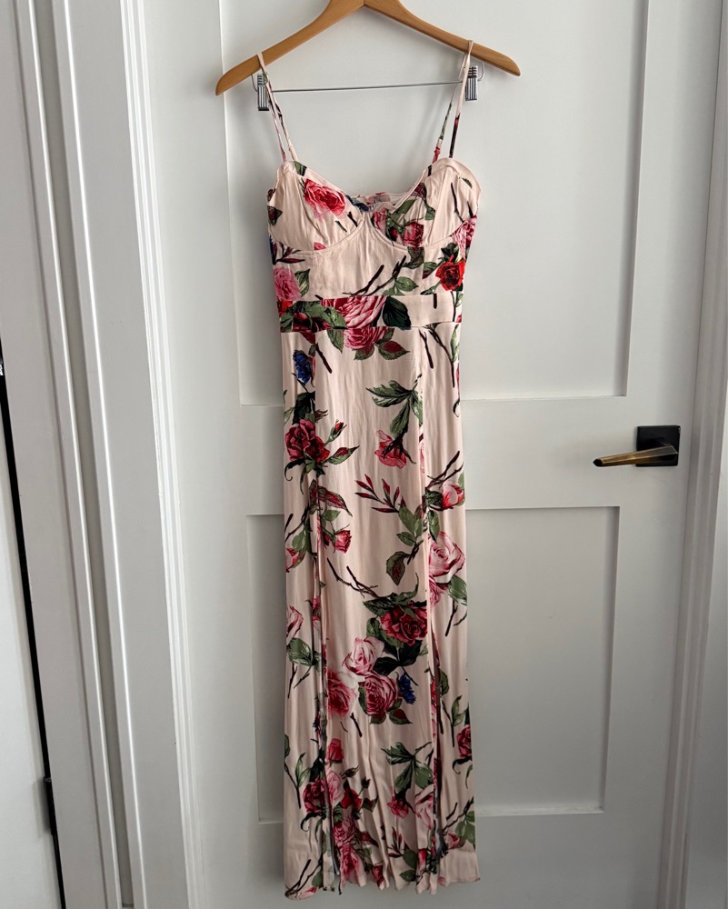 AFRM Rose Print Dress with high slit, open back detail and faux molded cups