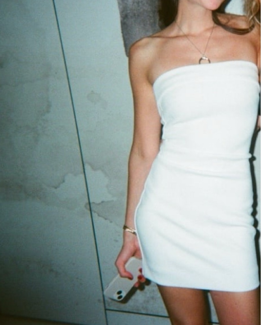 This sleek and sophisticated strapless dress is perfect for a special occasion. The form-fitting silhouette and clean lines create a modern and refined look.