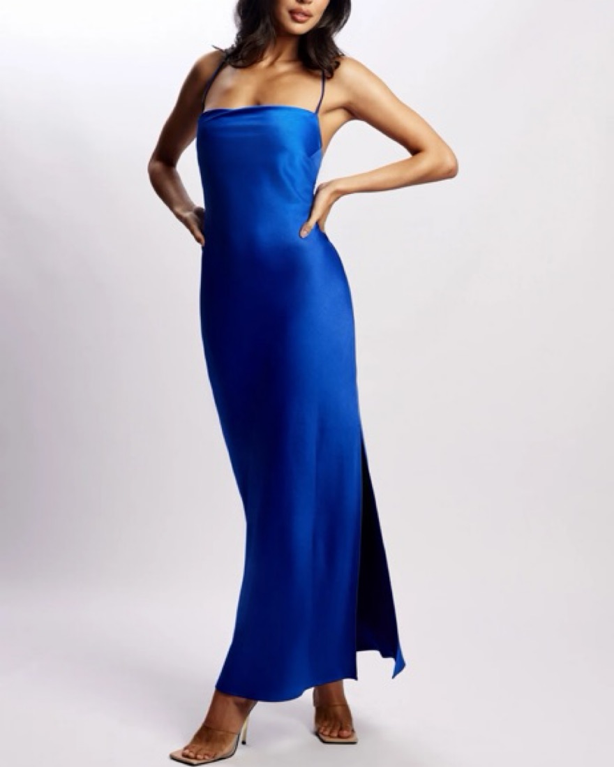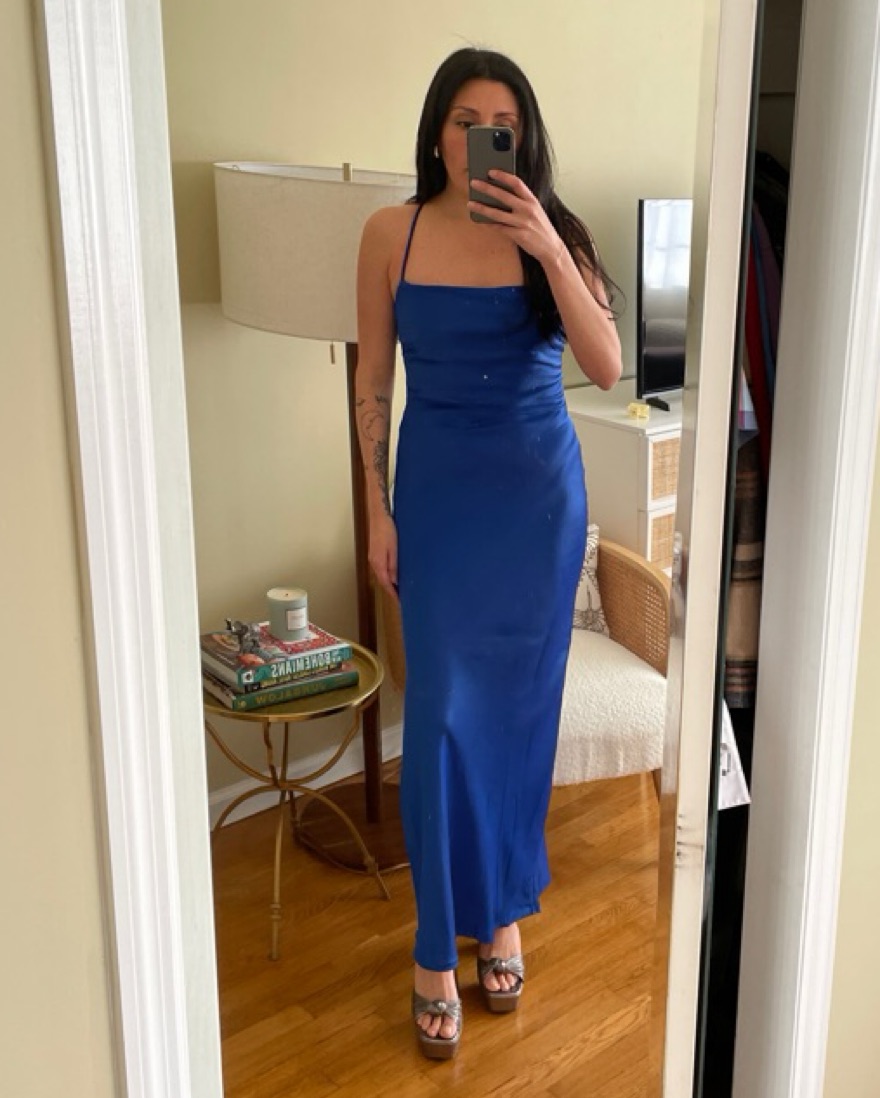 In a beautiful cobalt blue. Only worn once. Has a slit, square neck and open tie back.