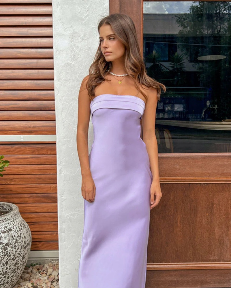 This stunning lavender satin gown is perfect for a special occasion. The flattering silhouette and elegant satin fabric make it a sophisticated and glamorous choice.