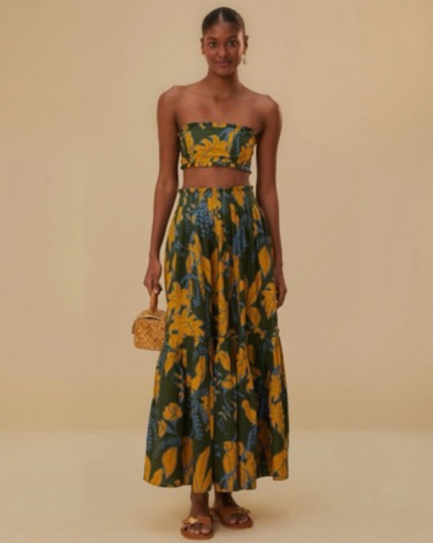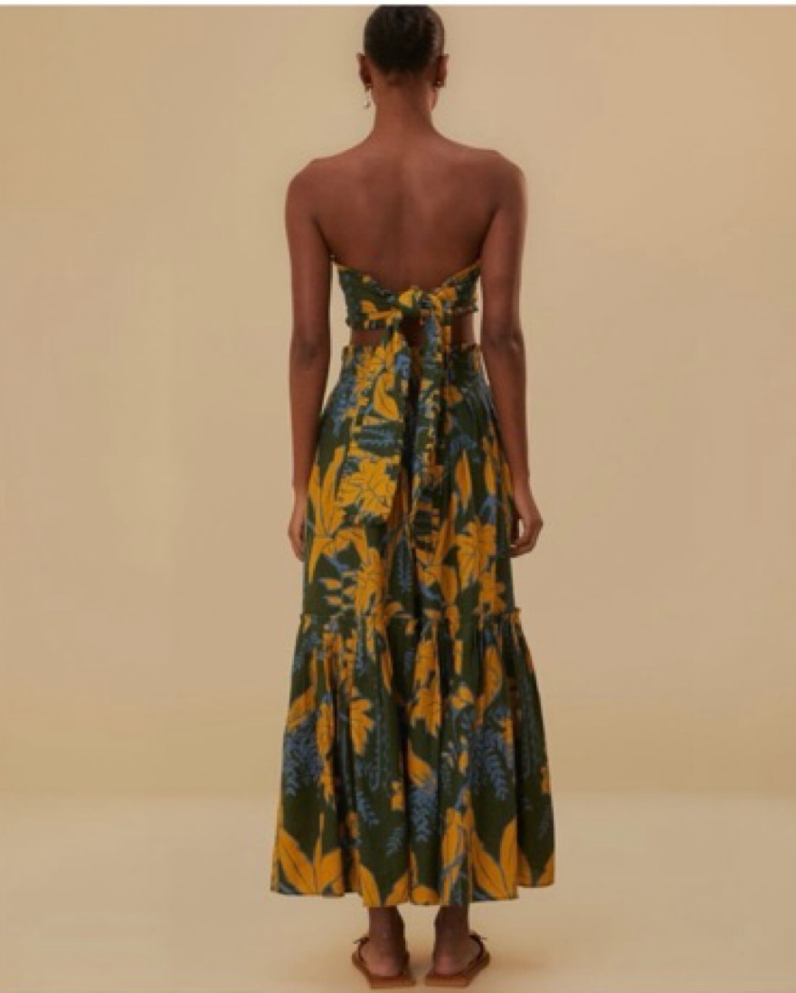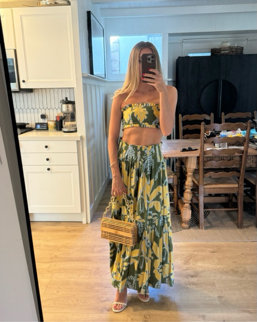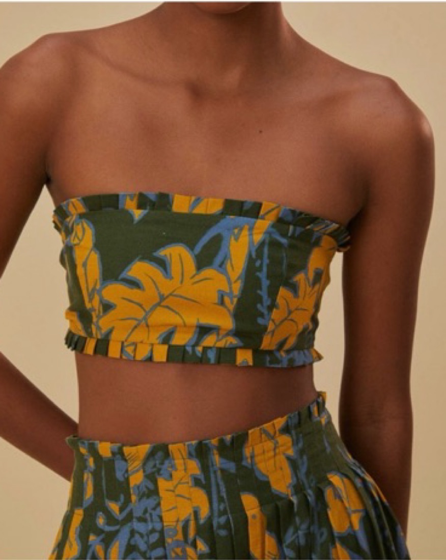 Size XS. Green/blue/yellow skirt and top. Top ties in the back and also has a hook closure. Definitely for a smaller chested gal. Wore to a country club wedding in Newport and got so many compliments. So comfy!