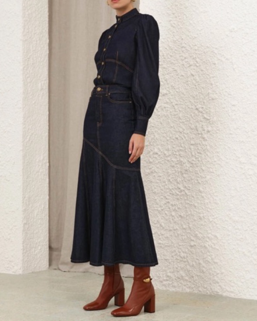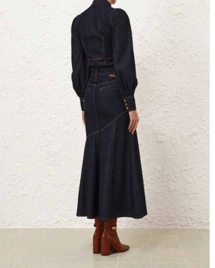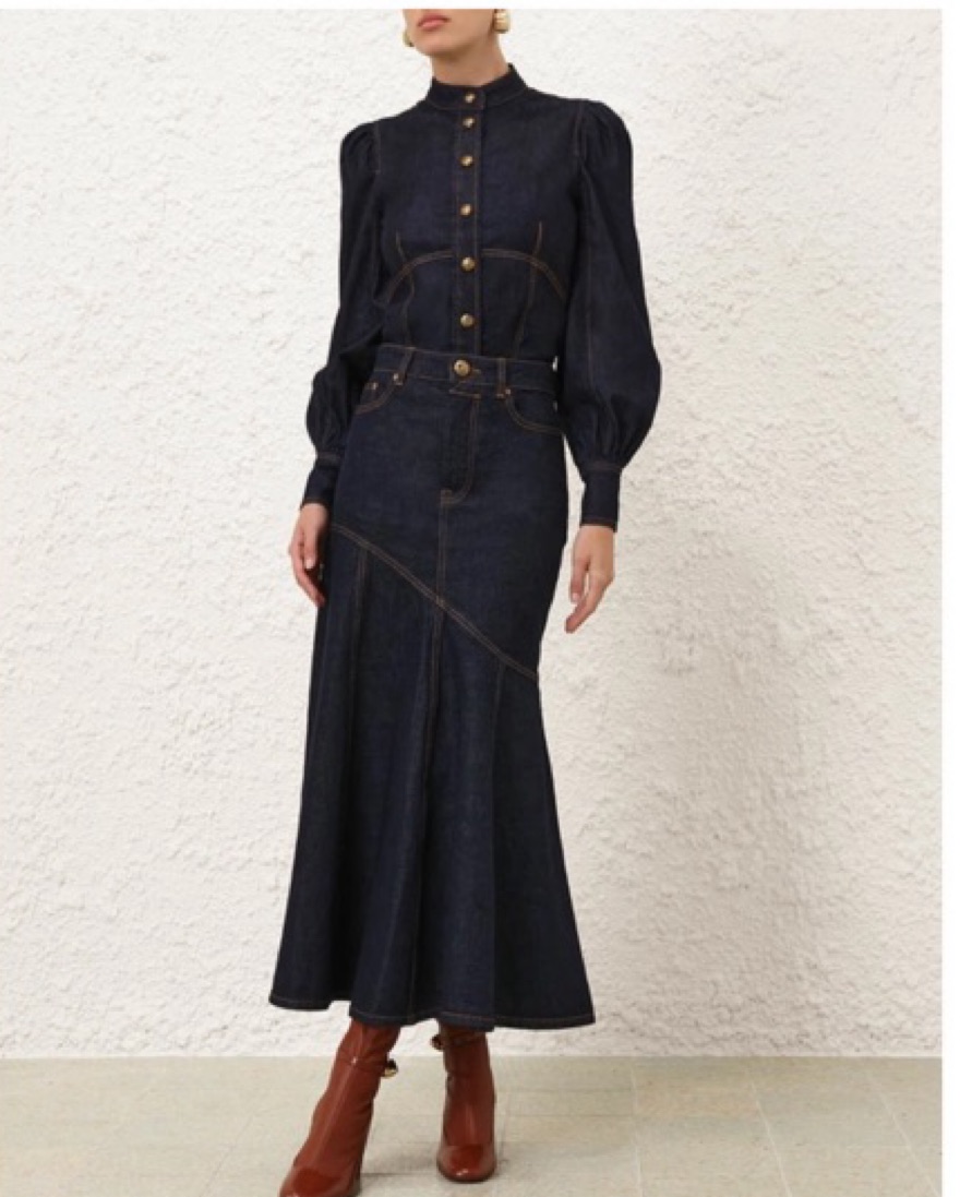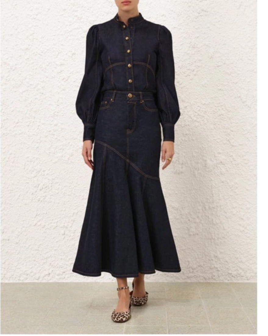 Zimmerman denim midi skirt in night sky (size 0) and zimmermann denim button down blouse (size 1). Can rent them out separate or together.