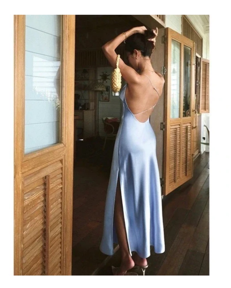 Satin light blue backless maxi dress, perfect for a birthday, wedding, black tie or any formal occasion. has very small discoloring on the left of the bottom of the dress.