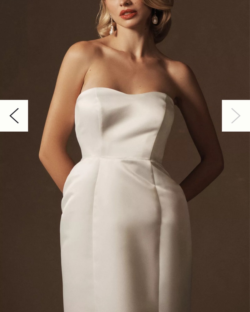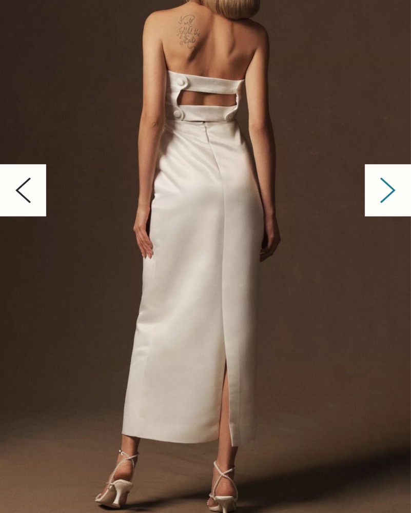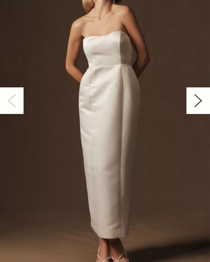 This midi dress by BHLDN features a bold, strapless design with exaggerated hips, creating a dramatic silhouette for a striking, elegant look. Fits like a Size 0.