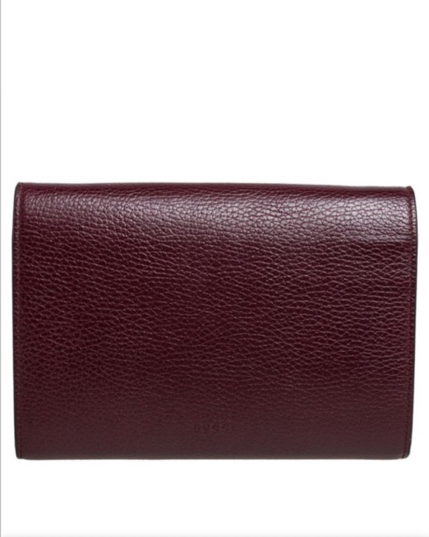 Gucci Dionysus wallet on chain in burgundy leather. Flap has horseshoe tiger heads and secures interior with card holders and various compartments. Shoulder chain can be worn diff ways or tucked in for clutch. Pristine condition
