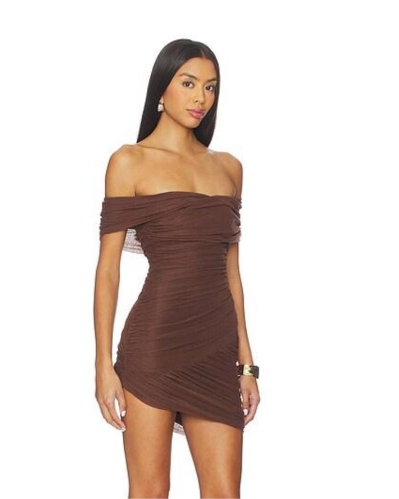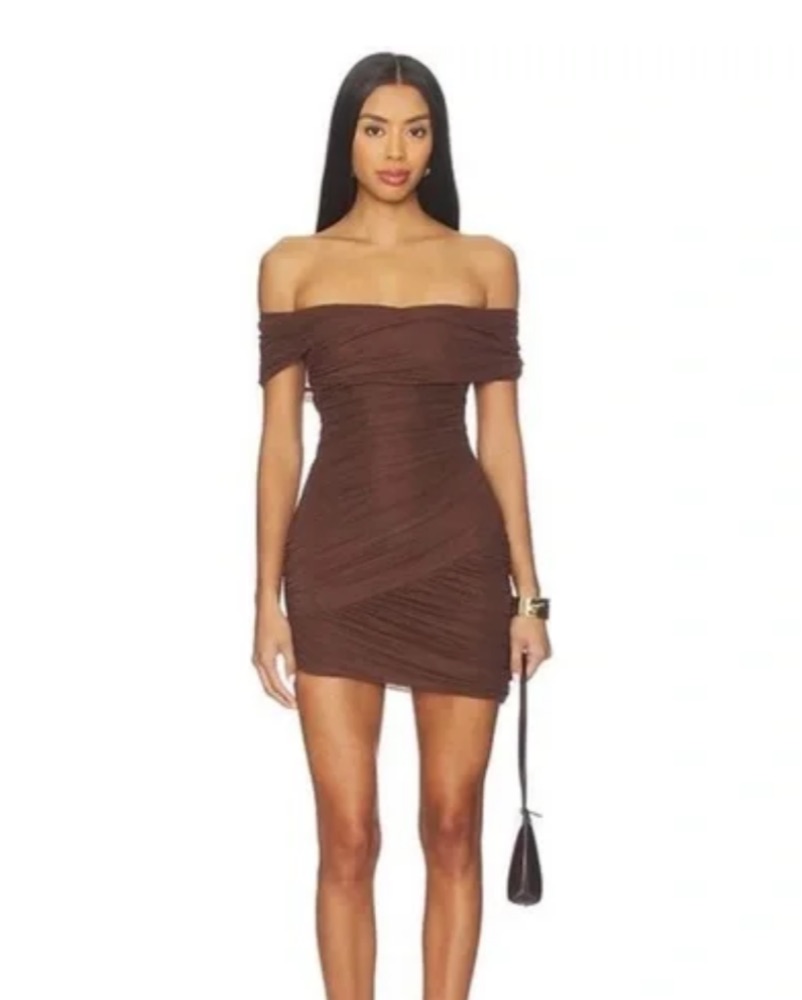 This alluring off-the-shoulder mini dress in a rich brown hue exudes effortless sophistication. It's the perfect choice for a night out or special occasion.
