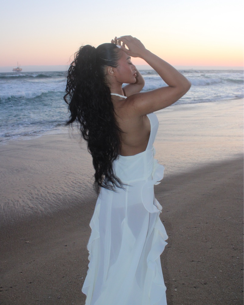 This stunning white halter dress is perfect for a romantic sunset stroll on the beach. The flowing maxi silhouette and plunging neckline create a chic, sophisticated look.