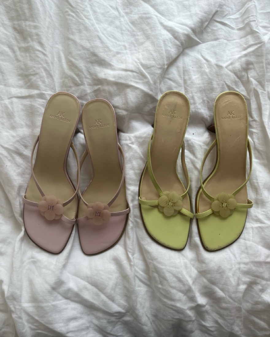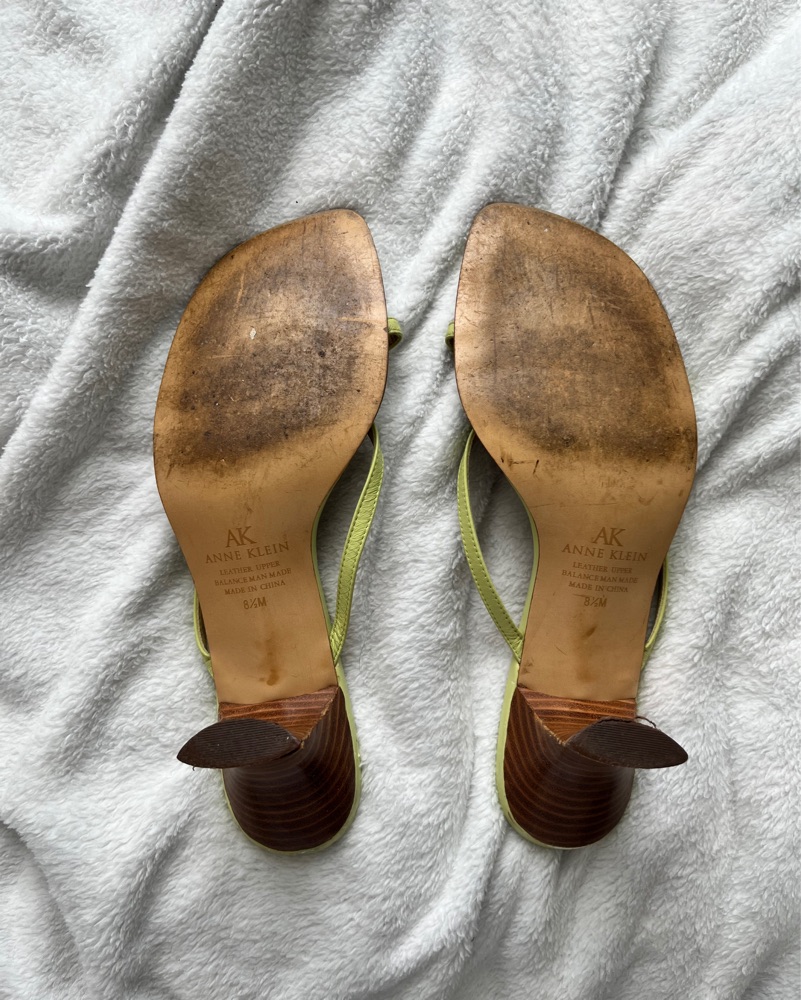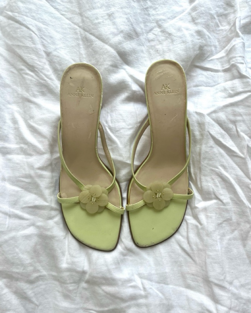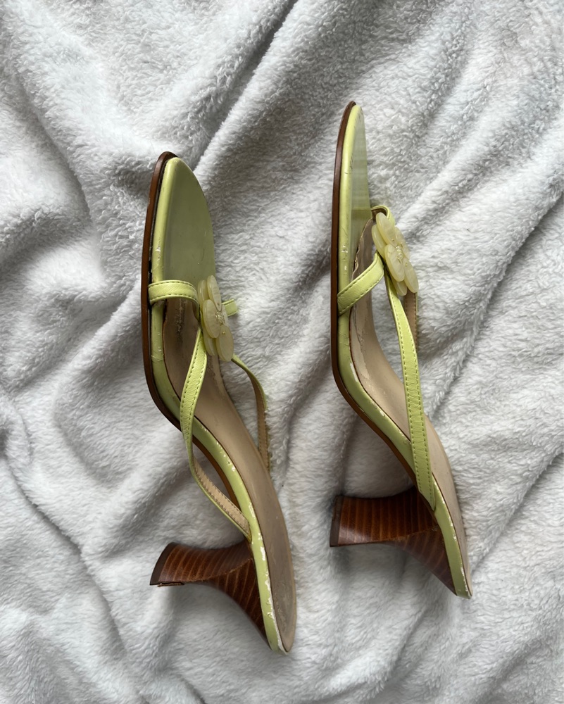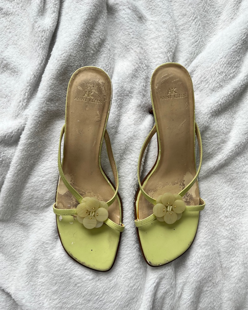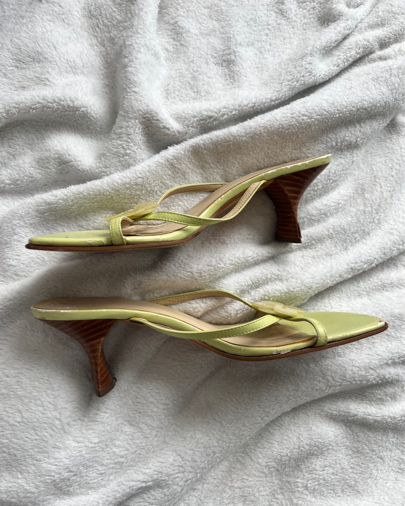 Y2k flower detail leather heeled sandals. Light green. Size 8.5. 2000s Anne Klein, very 13 Going On 30! Also available in light pink. Please scroll for current condition.