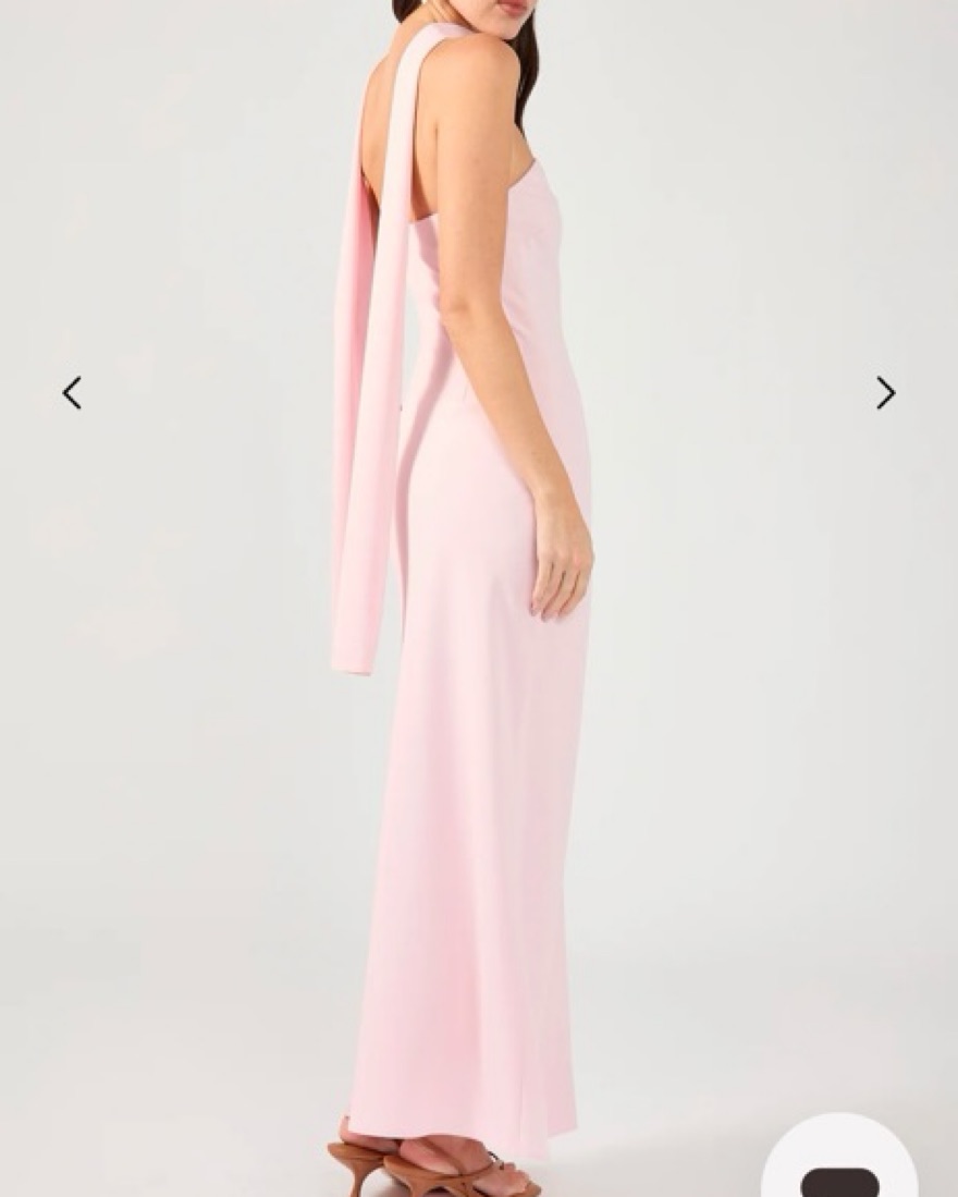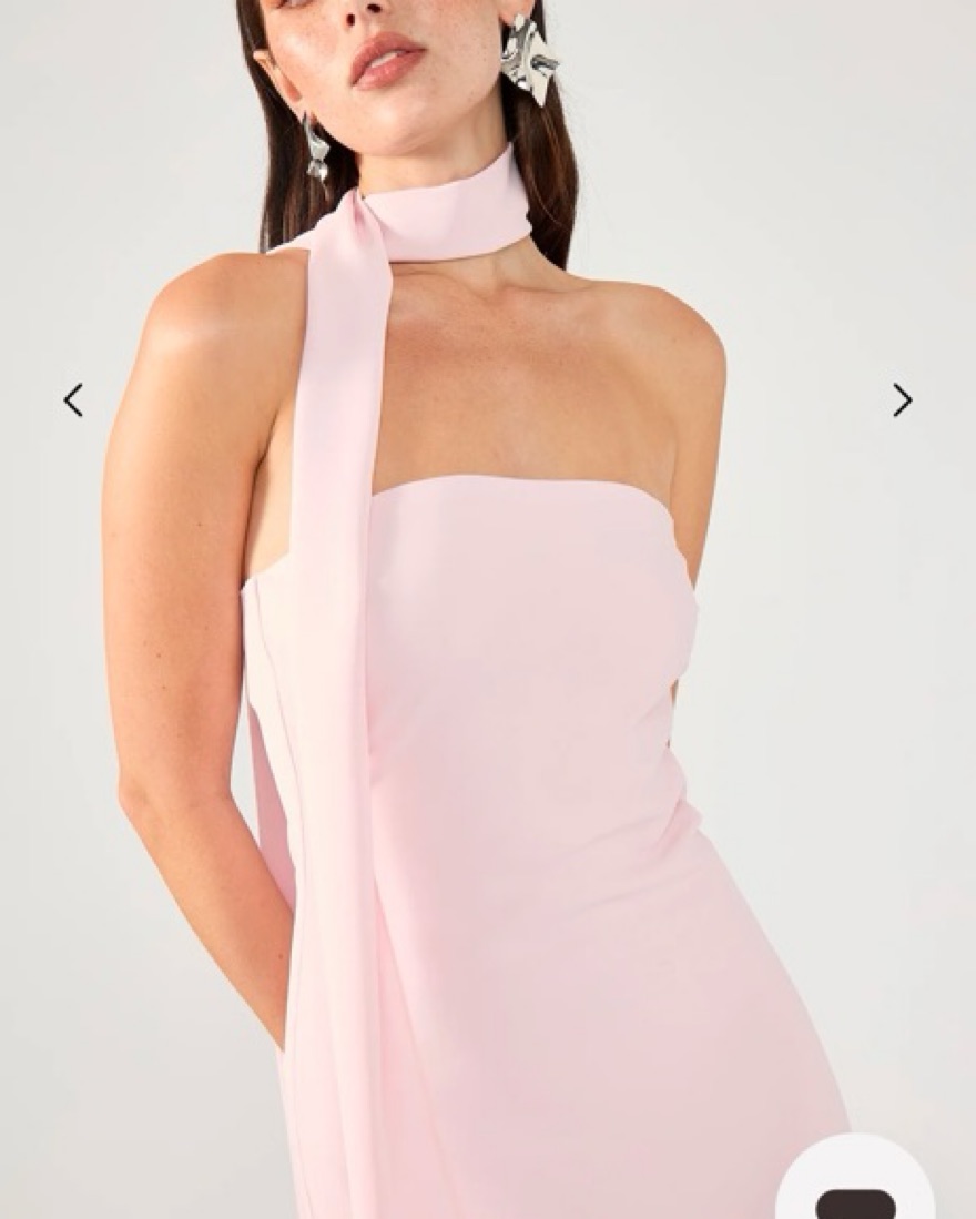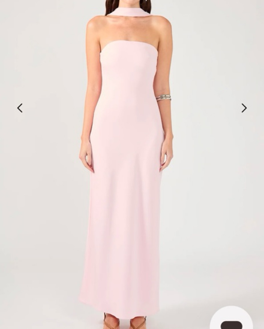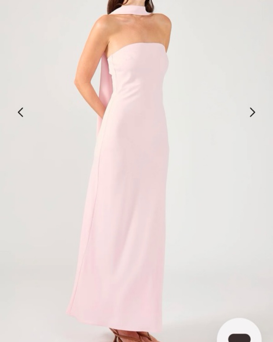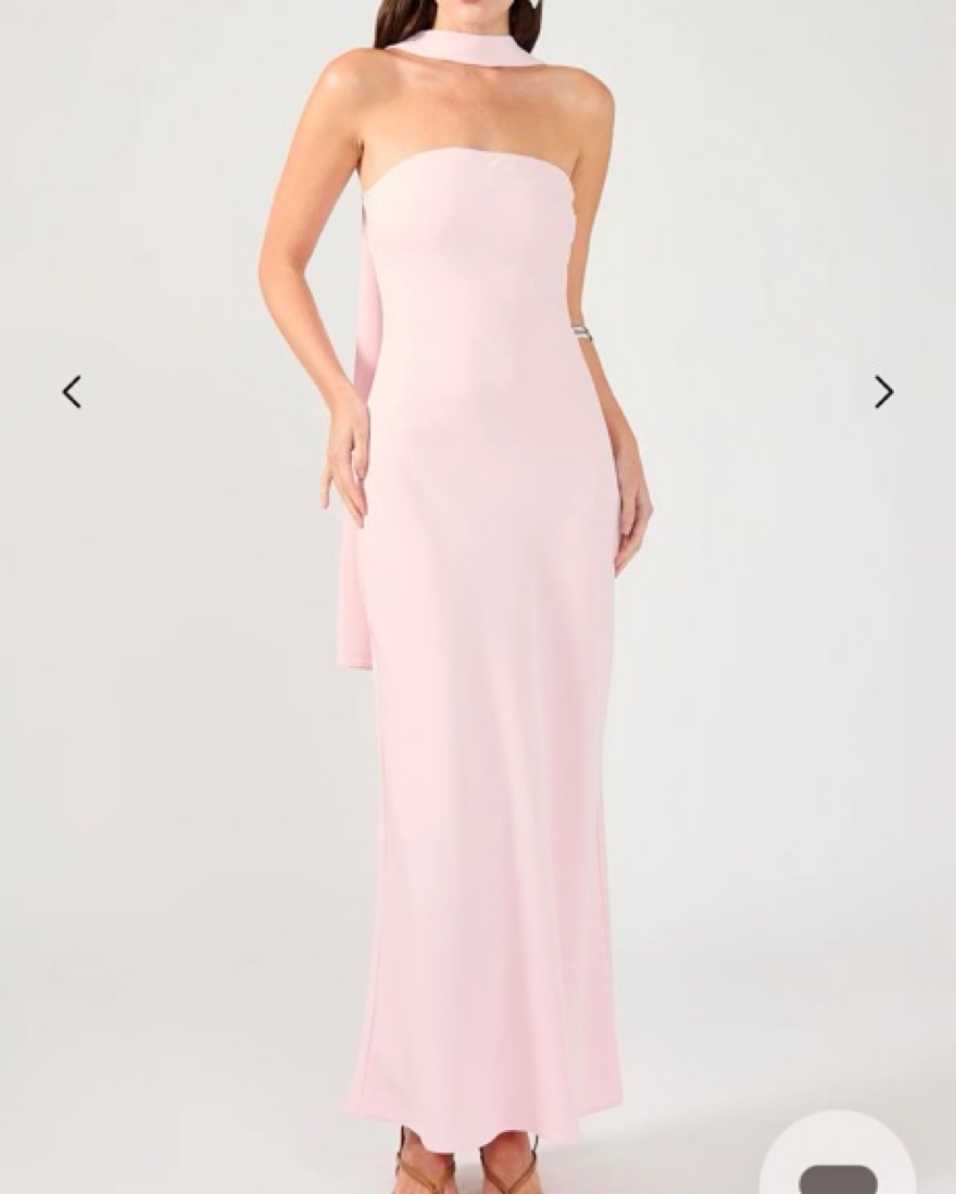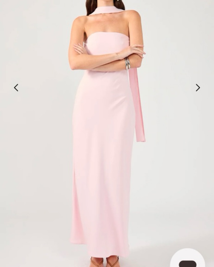 Baby pink; 2 pieces—strapless maxi dress with zipper and hook closure and scarf. Australian Size 10 US size 6 (Cup size DD+ does not allow the dress to zip)