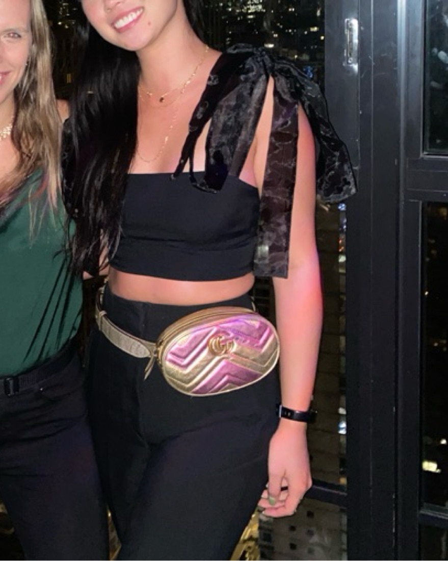 Oval Gucci Marmont belt bag, with adjustable strap and zippered blue silk interior. Heart detail on the back, can use as a clutch as well! I always get compliments on it!