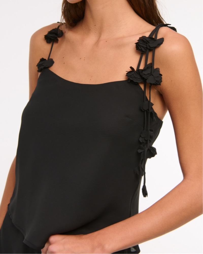 This sleek black cami with delicate floral accents is perfect for a night out or special occasion. The adjustable straps and flowy silhouette create a flattering and feminine look.