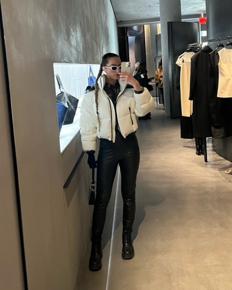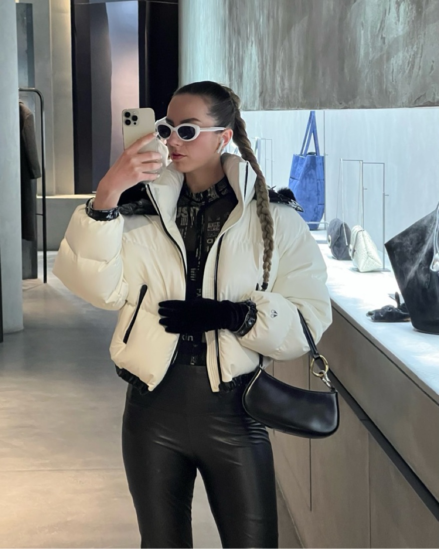 Short Puffer jacket-perfect for city and for the mountain trip. Definitely made for cold temperatures/snow as it’s super insulating. Features a black latex finish on the hood with super cute fuzzy Pom Poms also in black.
