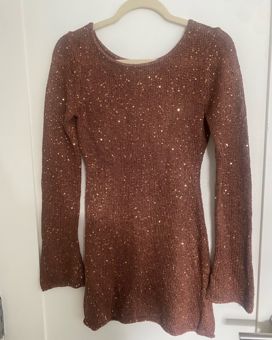 Knitted sequin chocolate brown dress! Super pretty but is a little see through. This dess runs small and is short! It is best for sizes 6 and under. Please note: this dress snags easily so please be careful/gentle with her :)