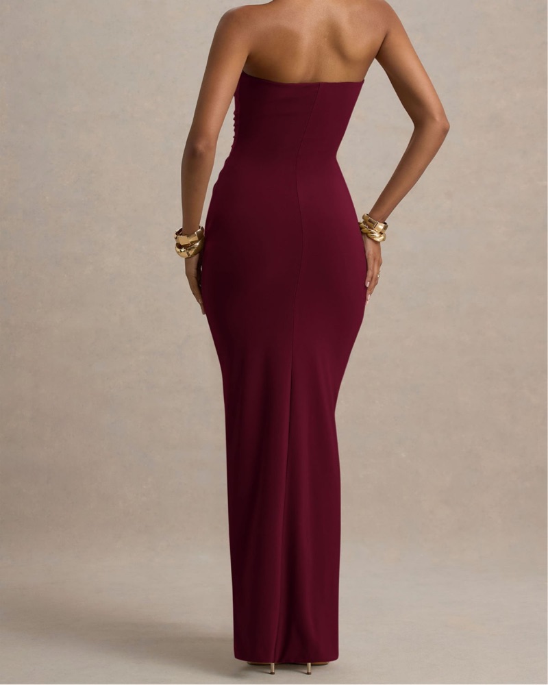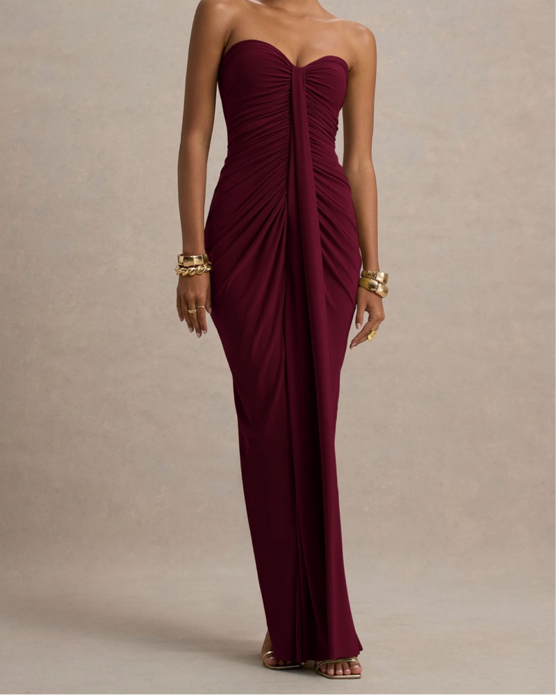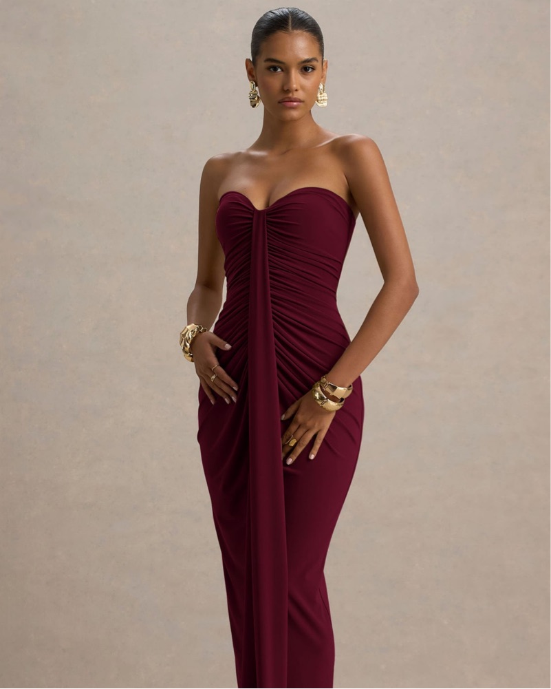 This striking burgundy gown is perfect for a glamorous evening event. The figure-flattering ruched design and sweeping silhouette create an elegant, sophisticated look.