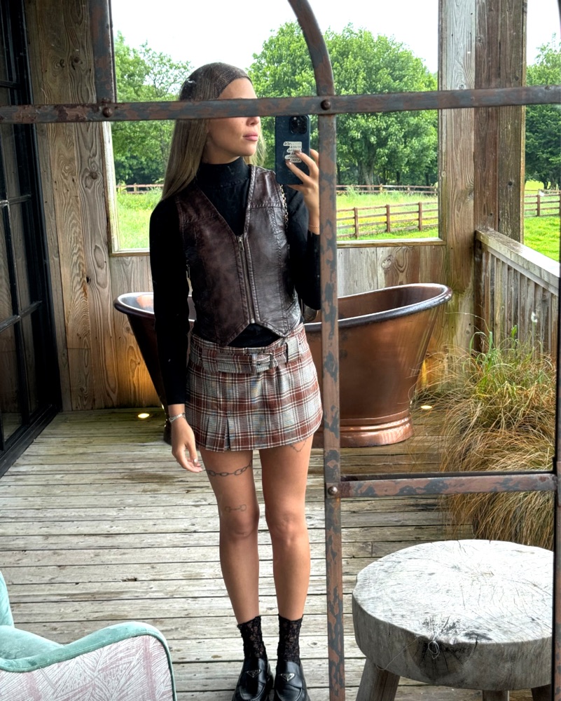 It’s not sage in color, not sure why that’s its name. The brown leather vest and the houndstooth blazer I paired with this is also available for rent! Size 0 Free People fits like a size 2