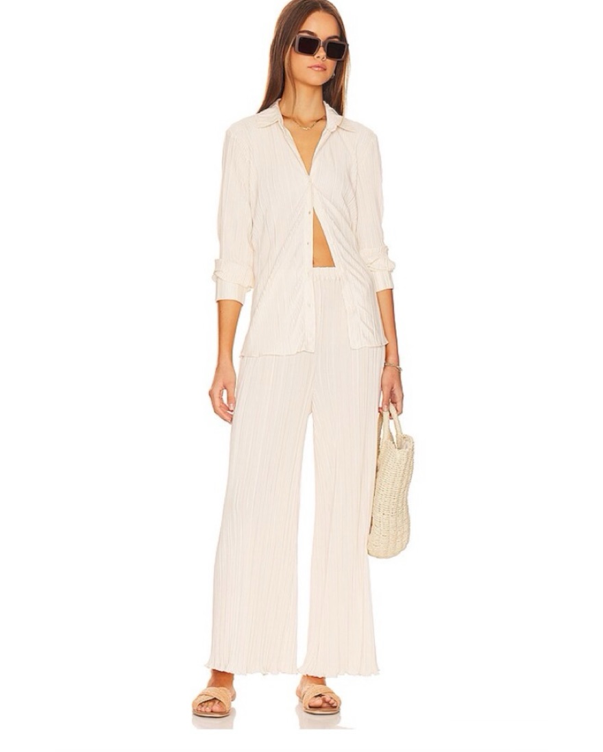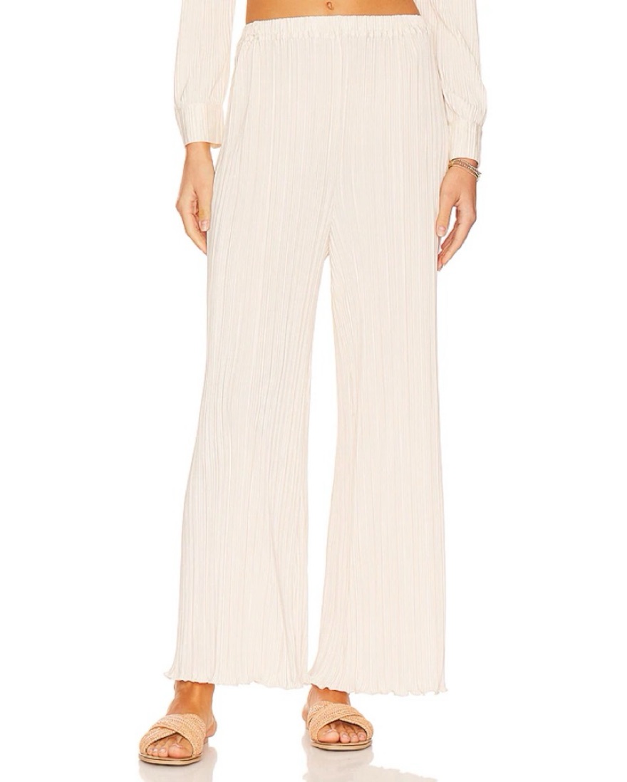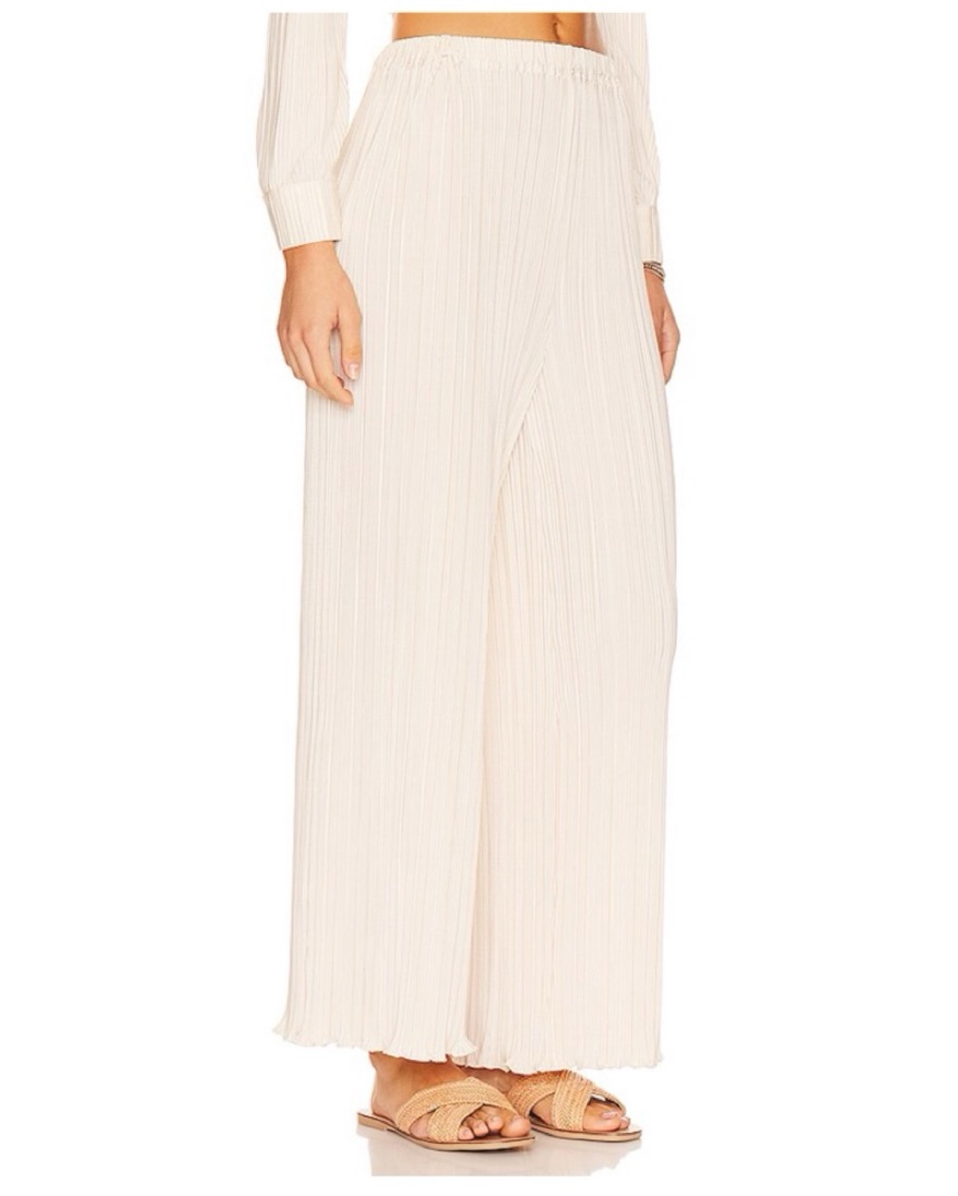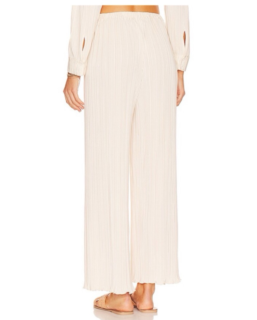 Perfect ivory beach pants with pleated fabric and lettuce cut hem. Elastic waistband