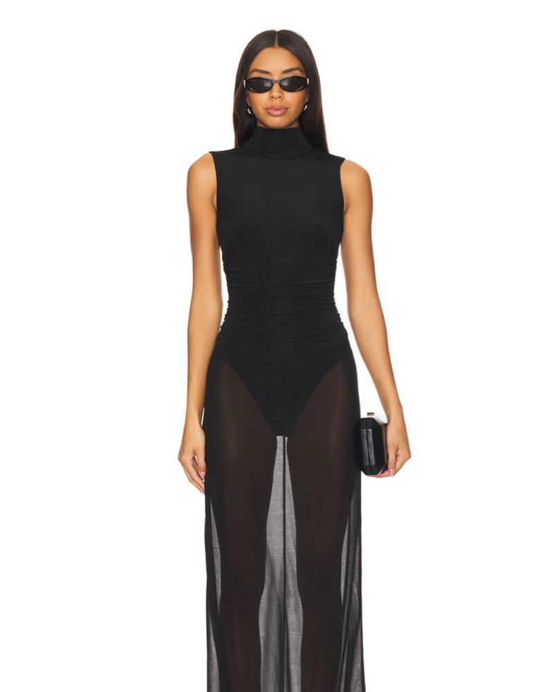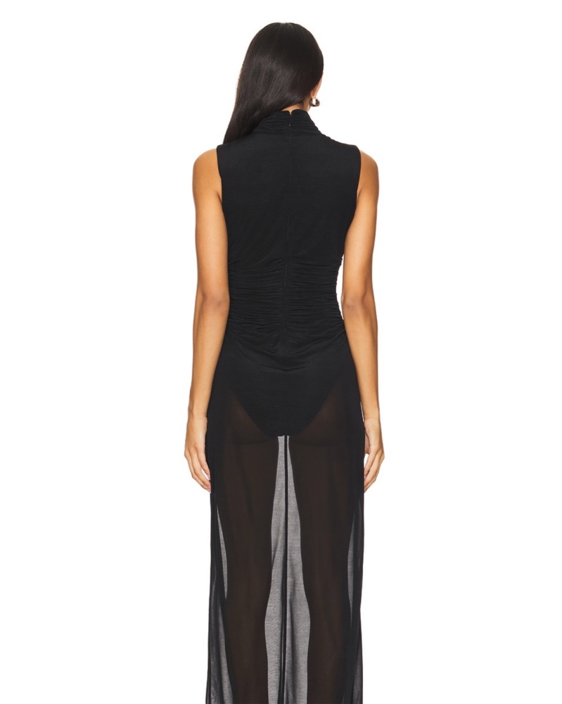 This stunning black maxi dress is perfect for a formal event or a night out. The ruched detailing and sheer panels add a touch of drama and sophistication to the look.