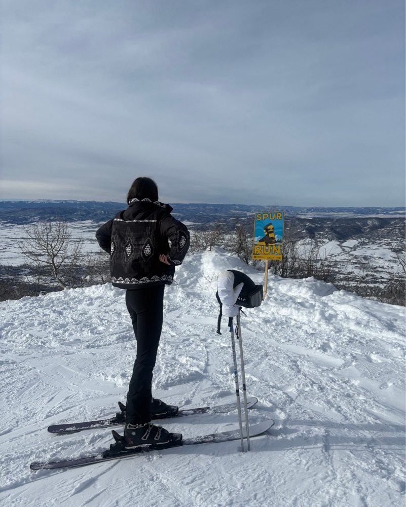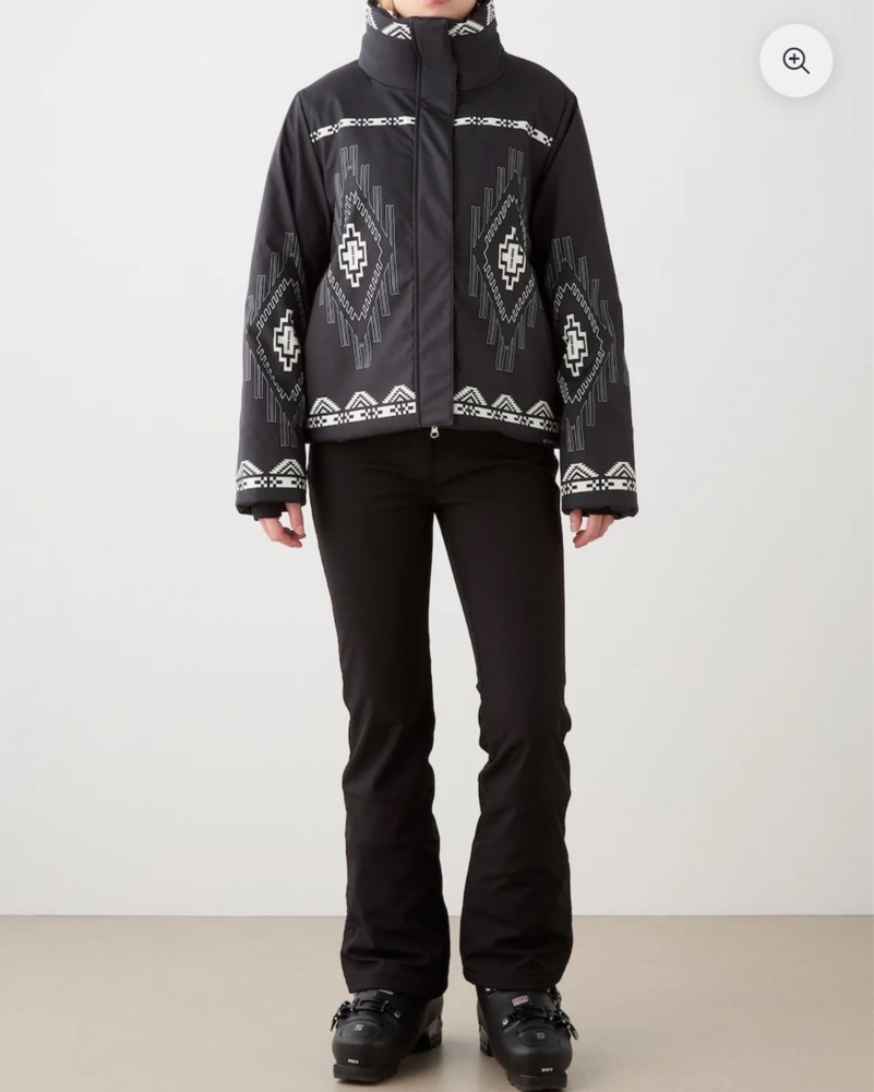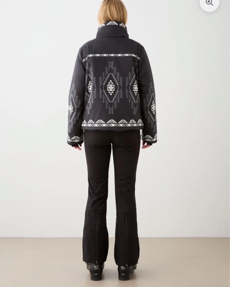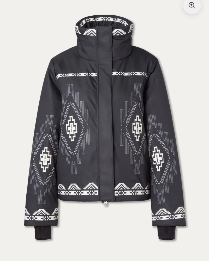 Statement ski jacket from We Norwegians featuring a bold Nordic geometric print in black and white. Warm, structured, and chic enough for après or city winter looks. High collar, cozy fit, and major Scandi cool.