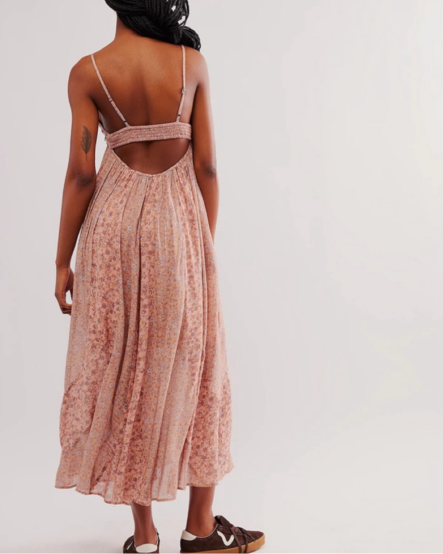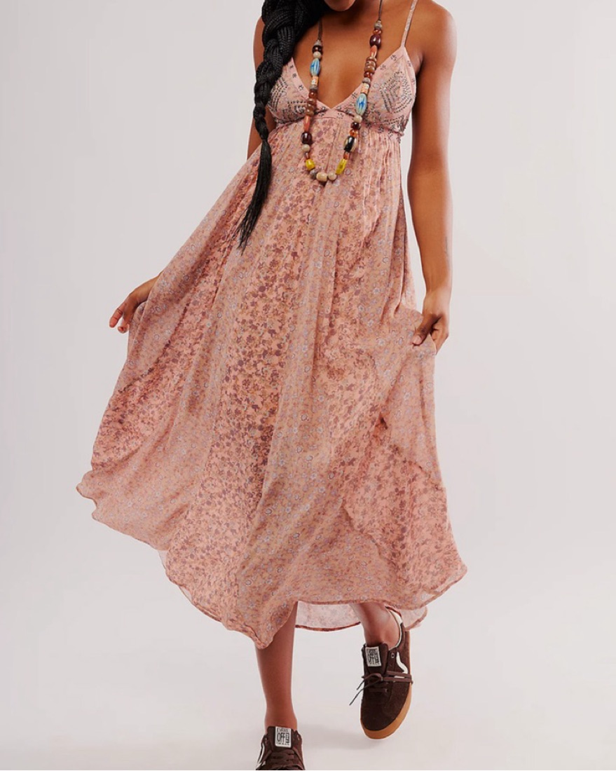Only worn once, super flattering and comfy! “Turn heads in this timeless maxi dress featured in a femme, mixed floral print design with beading at bust and super exposed back for added dimension. Relaxed, flowy fit. V-neckline. Adjustable shoulder straps. Pockets.”