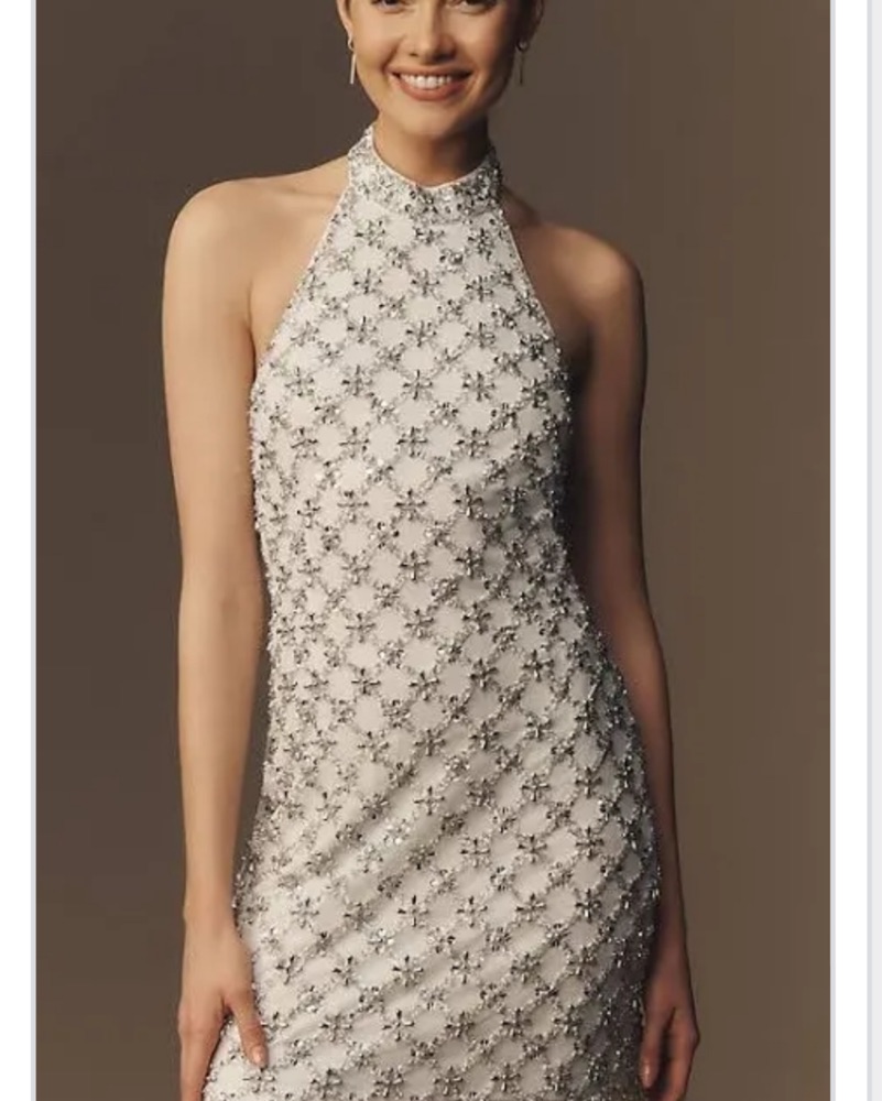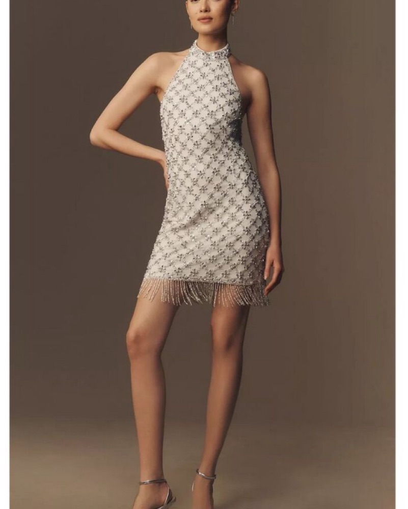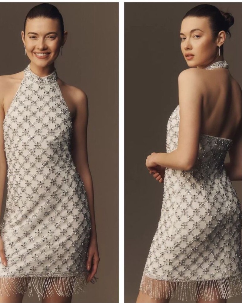 High neckline, size 4. Playful fringe detailing and bold silver beading. Perfect for bridal event or second look. Please no spray tans or makeup stains. Beads are delicate.