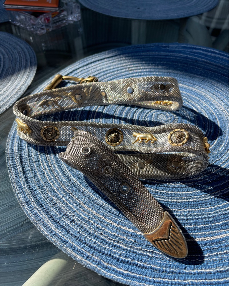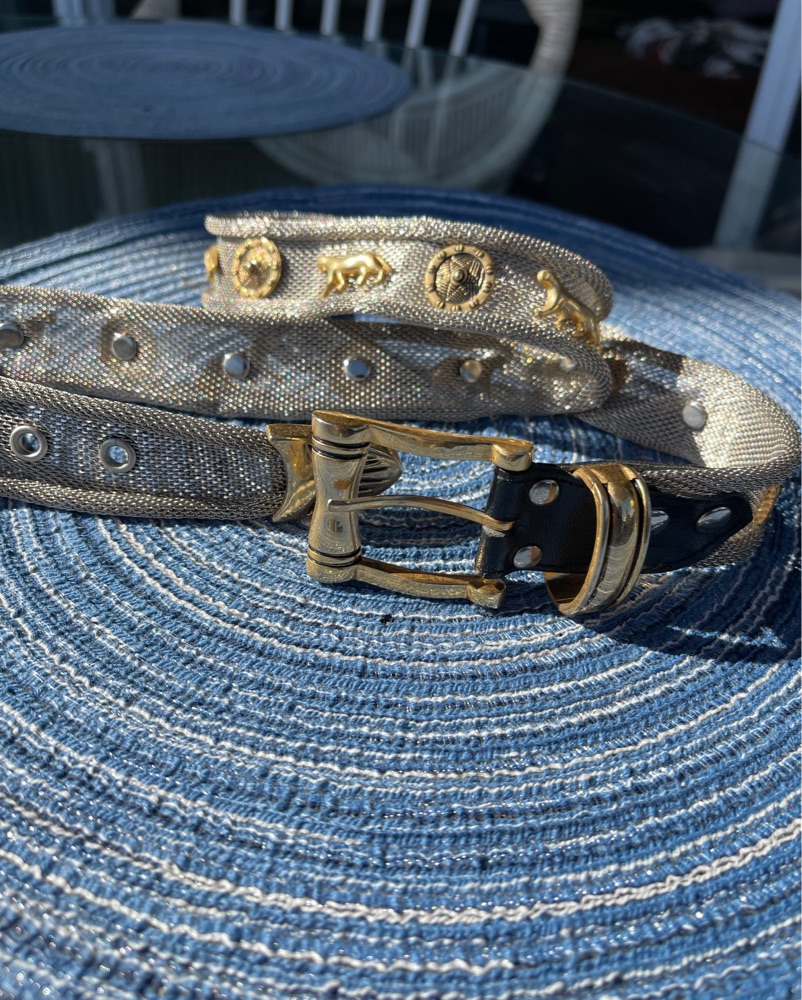 This stylish metal belt with intricate gold-toned embellishments adds a touch of glamour to any outfit. Pair it with your favorite jeans or dresses for a fashionable, elevated look.