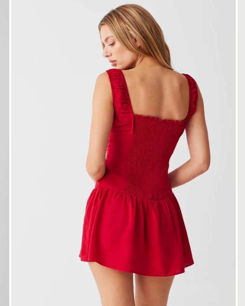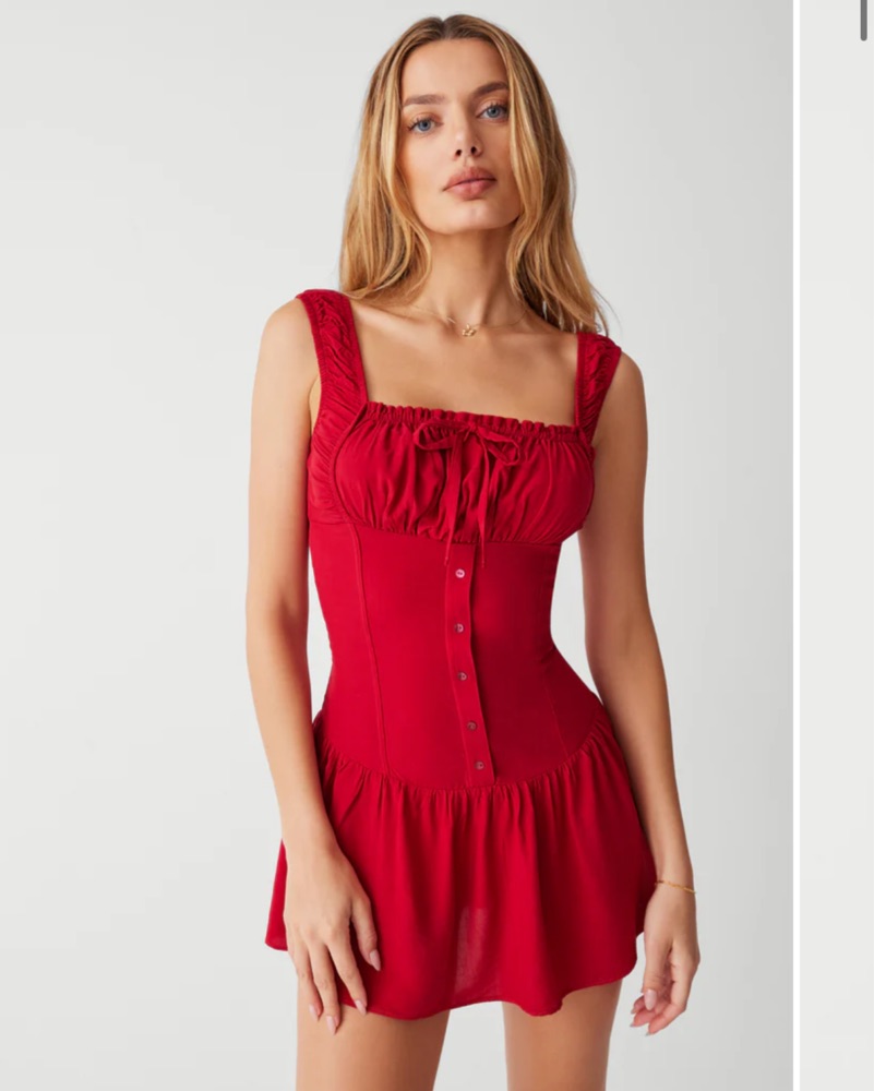 This stylish Frankie’s Bikinis red Christa ruffle mini dress features a flattering hemline design and button front closure, perfect for a night out or special event. Tags: red dress, Frankie’s Bikinis, Fourth of July, mini dress, corset dress.